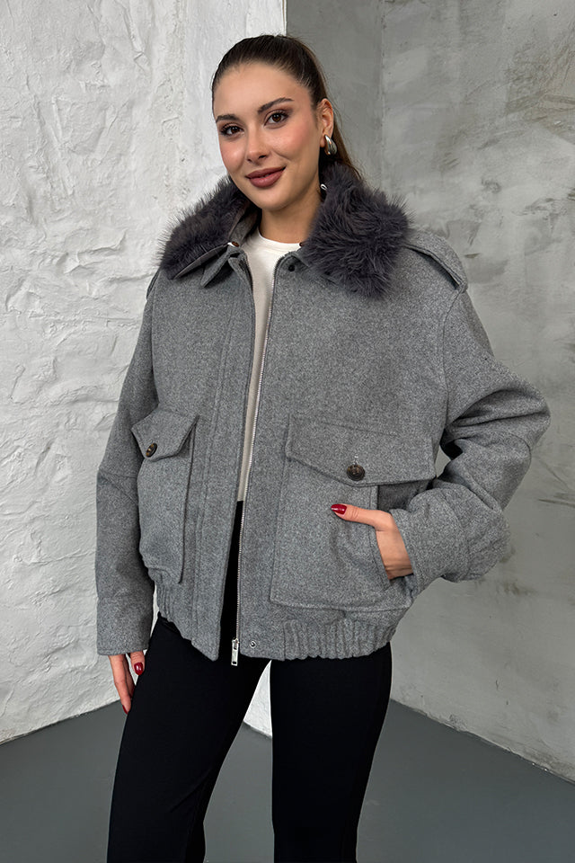 Gri Fularlı Kısa Kol Yumuşak Triko