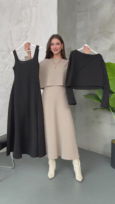Ekru Elbiseli Hırka Takım 10117-Ekru