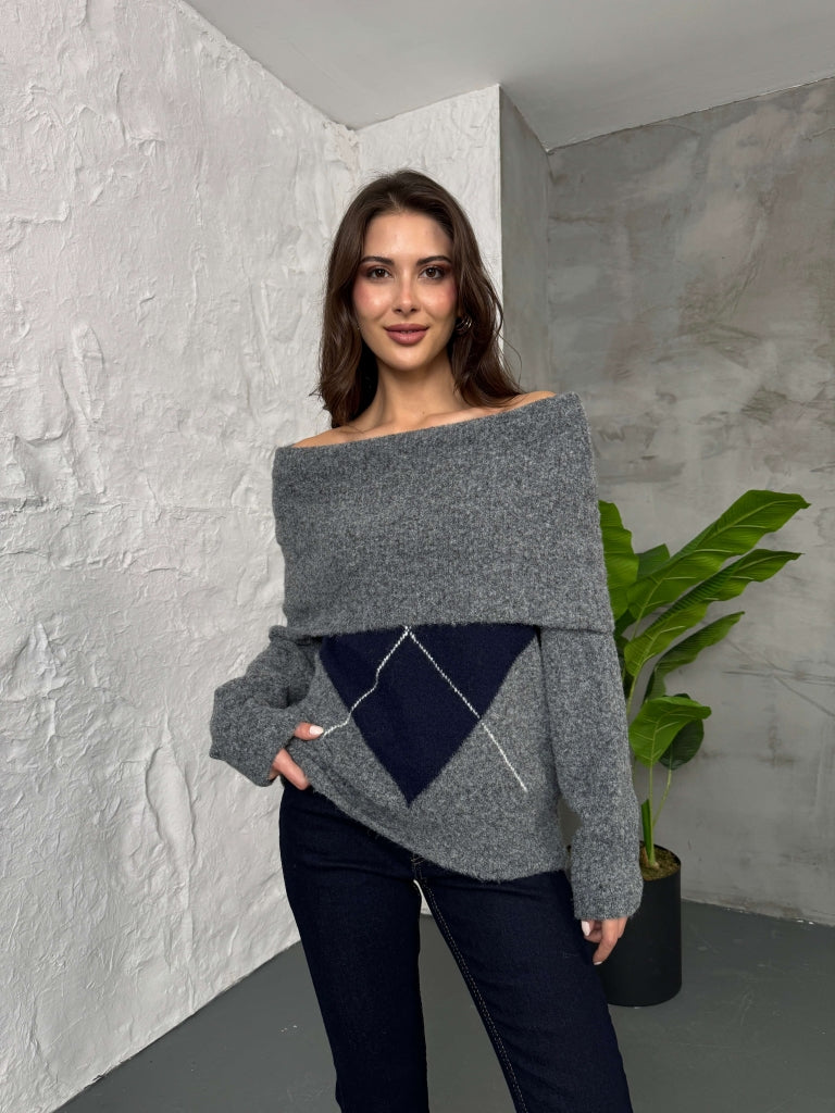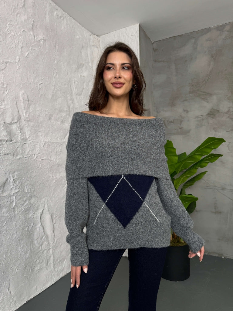 Antrasit Açık Yaka Baklava Desen Kazak 2530-Antrasit