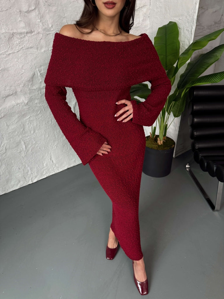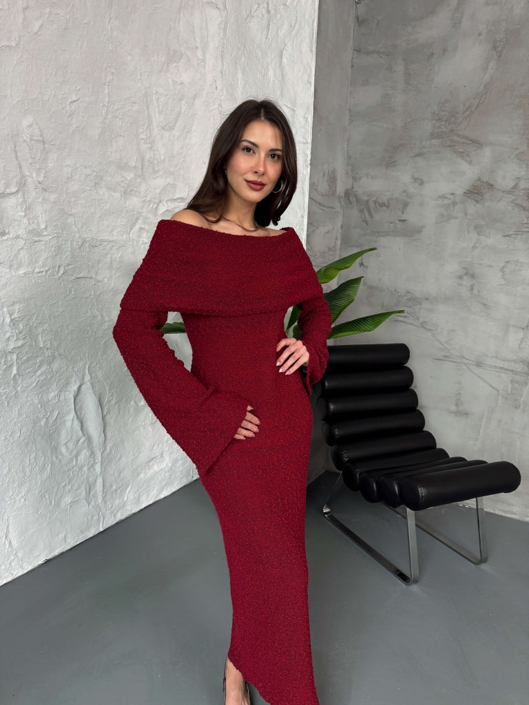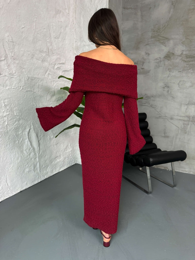 • Bordo Madonna Yaka Dokulu Triko Elbise