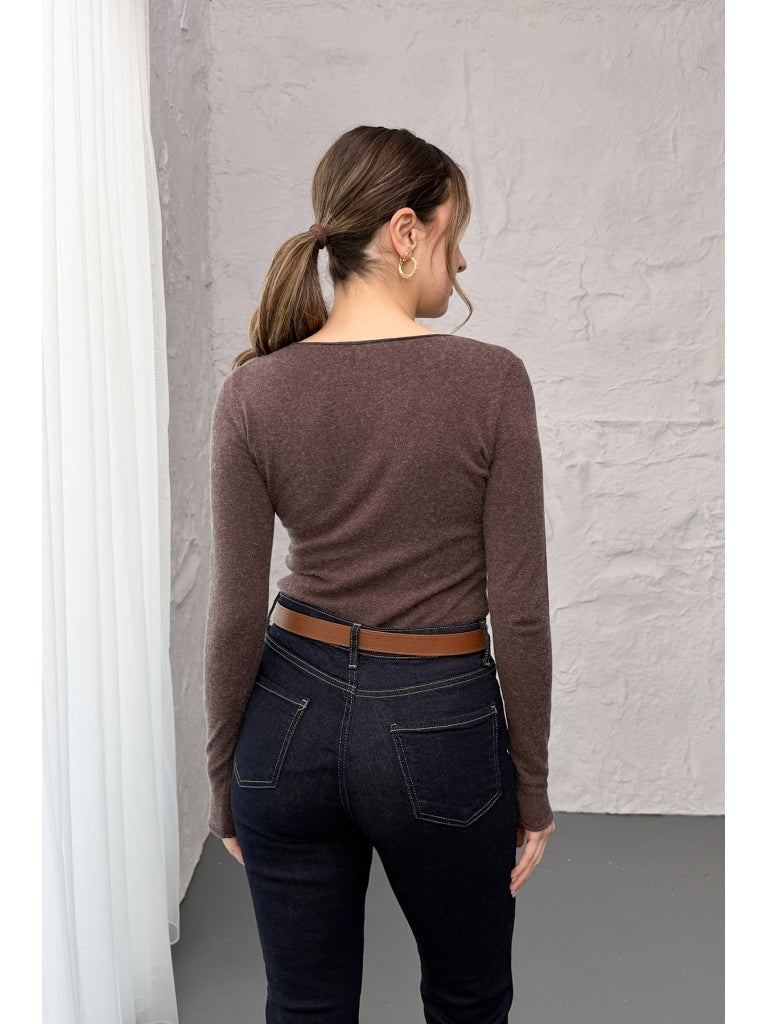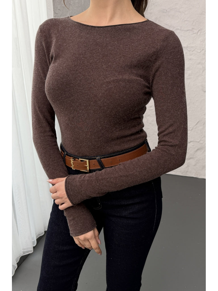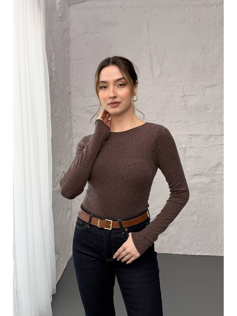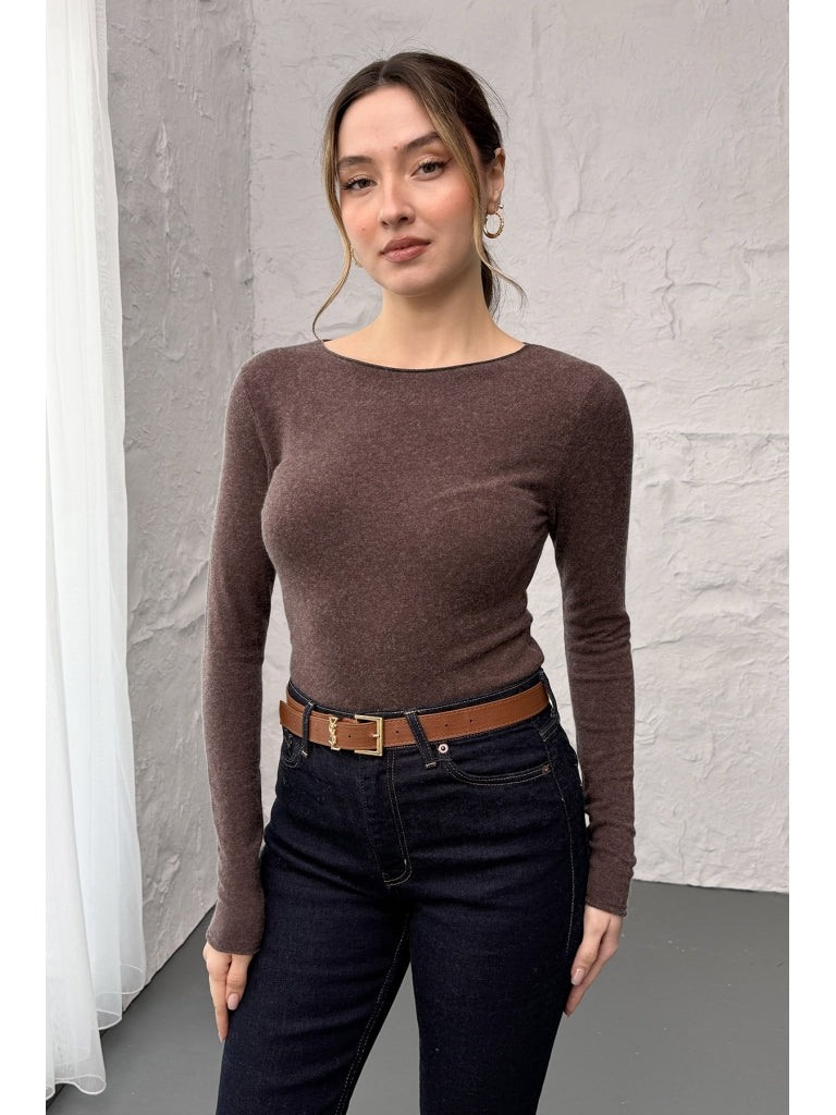 Dilvin Kahve Kayık Yaka Kaşmir Bluz 10840-Kahve