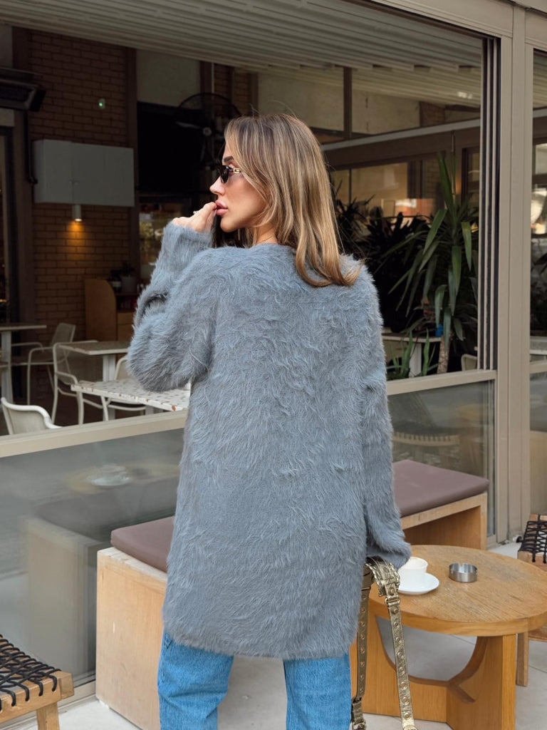 Gri Peluş Yumuşak Dokulu Bağlamalı Uzun Triko Hırka