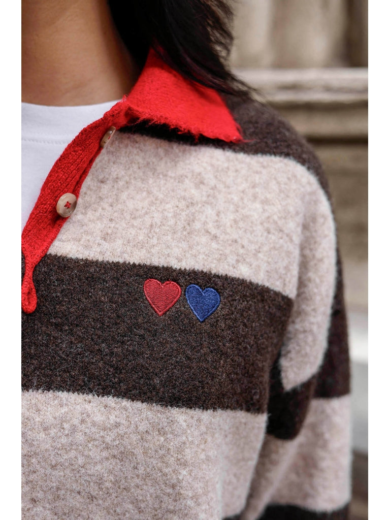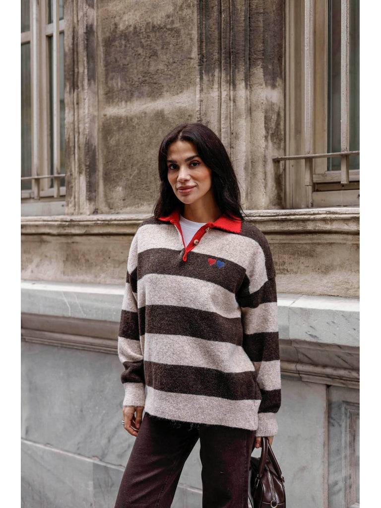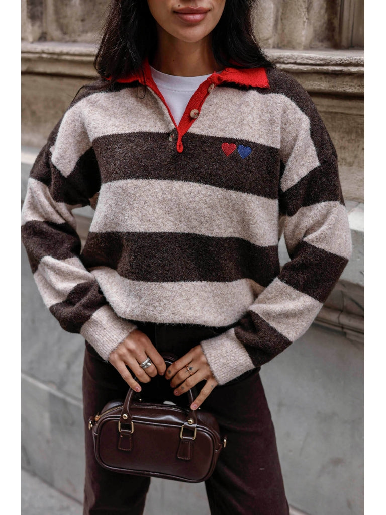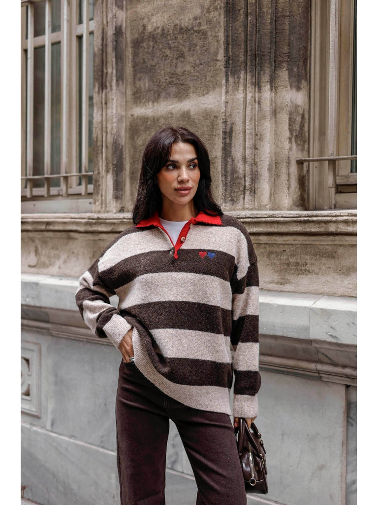 Kahve Polo Yaka Kalp Nakışlı Çizgili Kazak 2632-Kahve