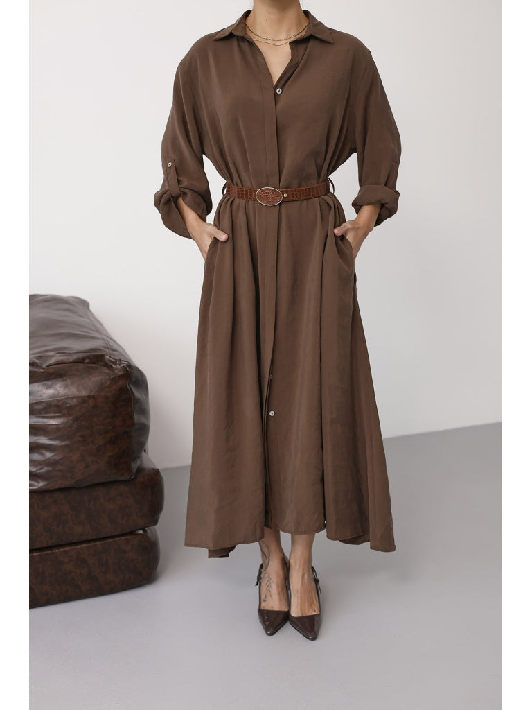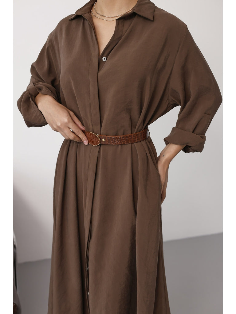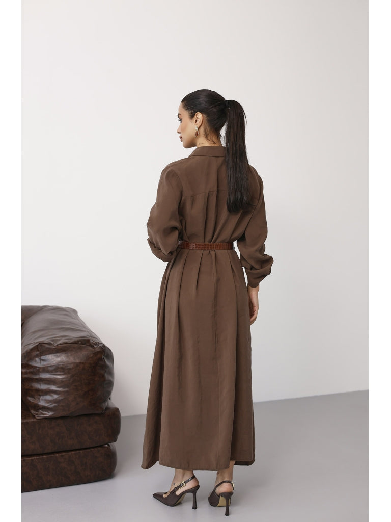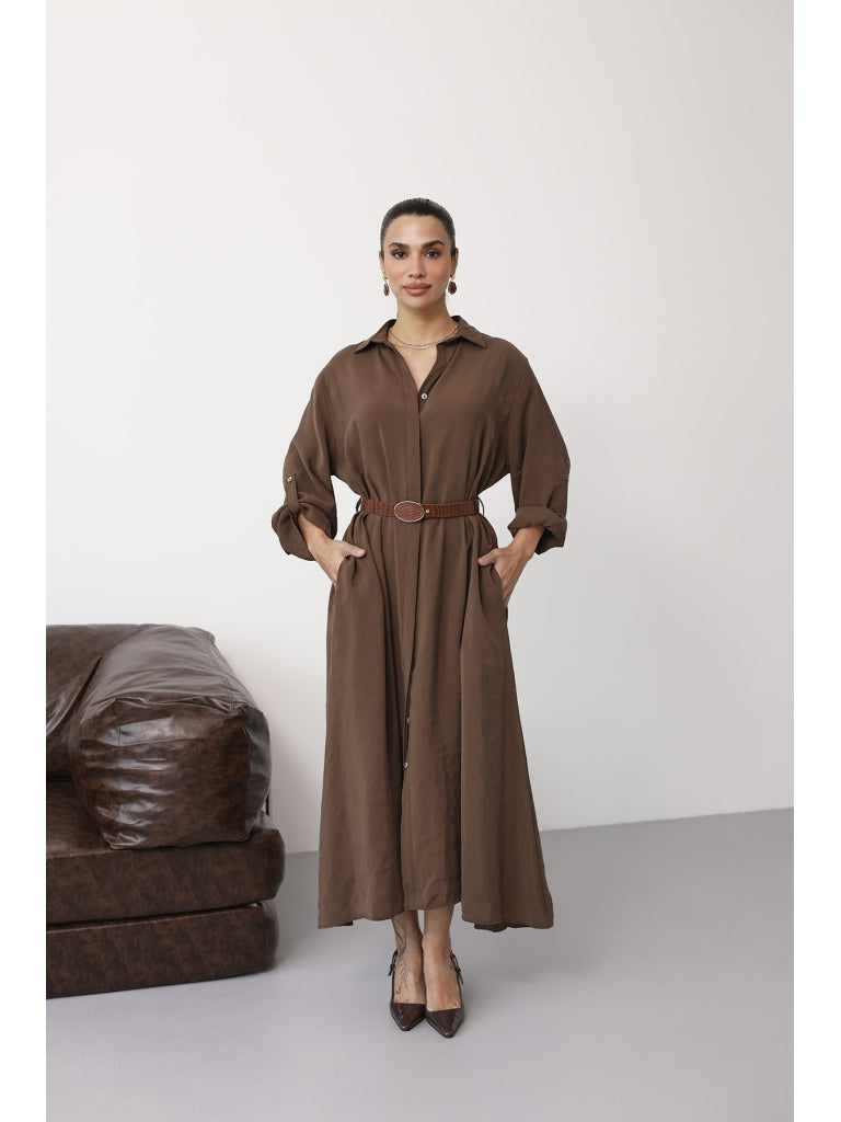 Kahve Tensel Kemerli Gömlek Elbise EYY3270-Kahve