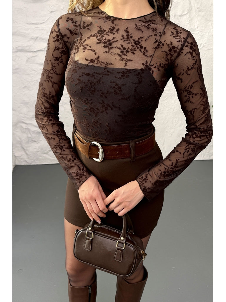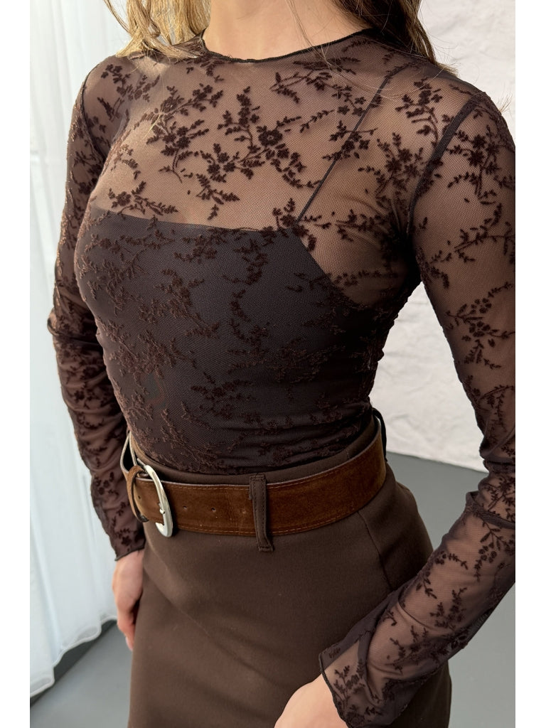Kahverengi Çiçekli Transparan Bluz 58447-Kahverengi