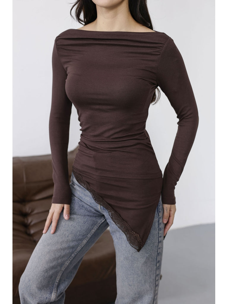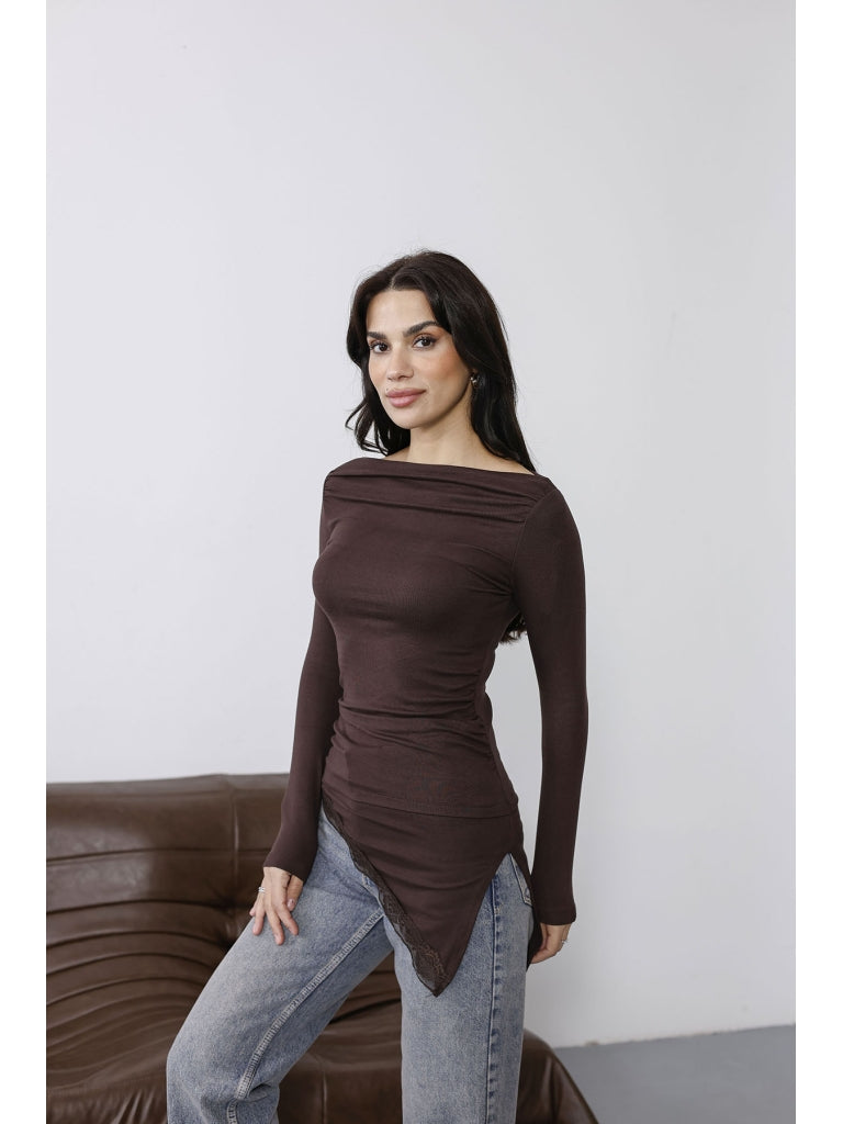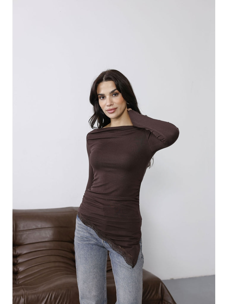 Kahverengi Eteği Dantel Detaylı Asimetrik Bluz 7505-Kahverengi