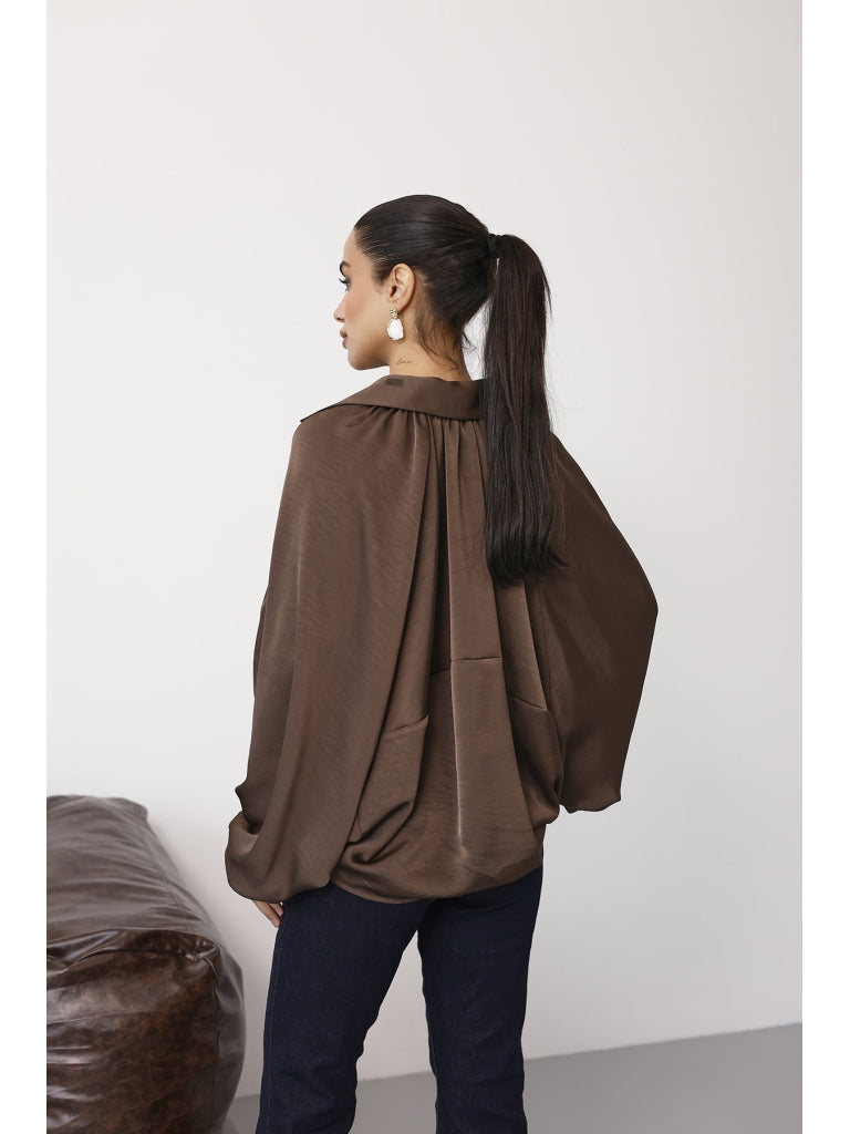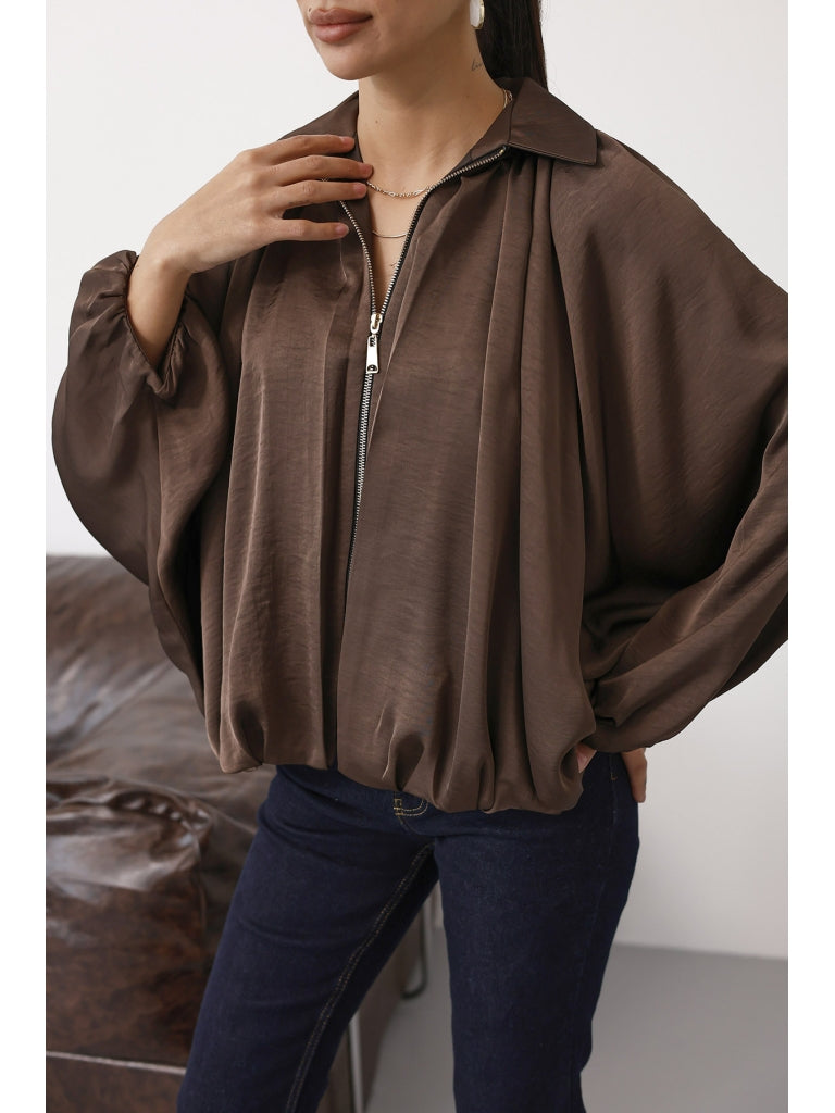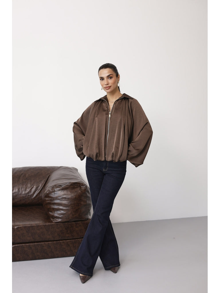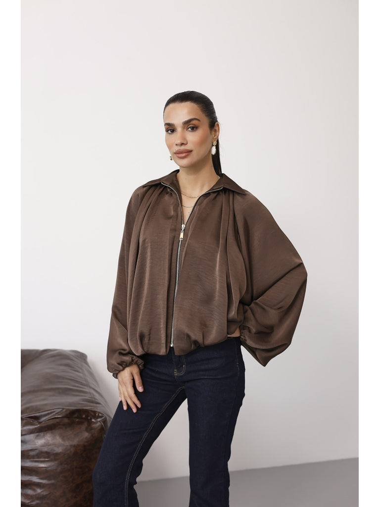 Kahverengi Ön Fermuarlı Bomber Saten Ceket 9584-Kahverengi