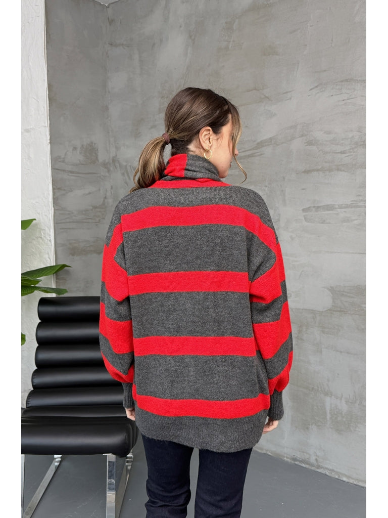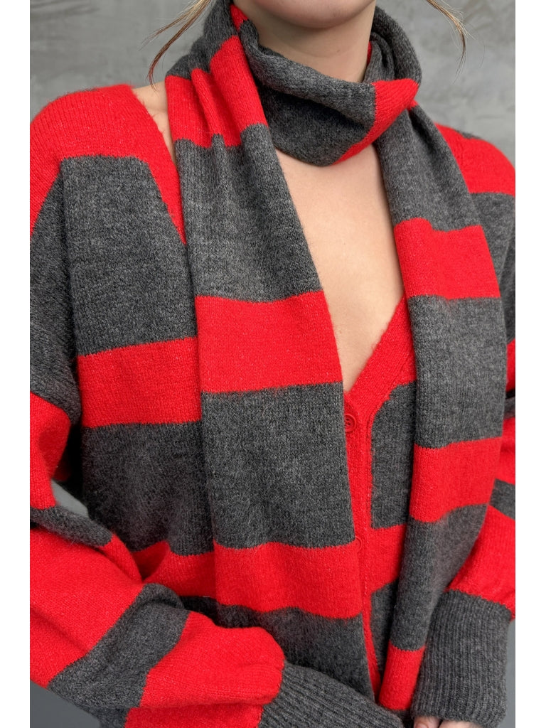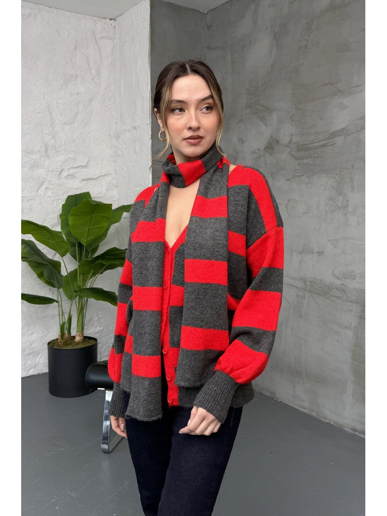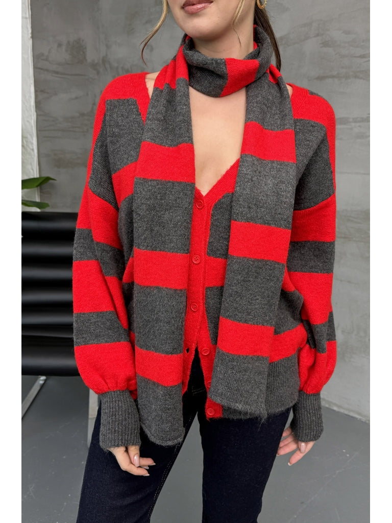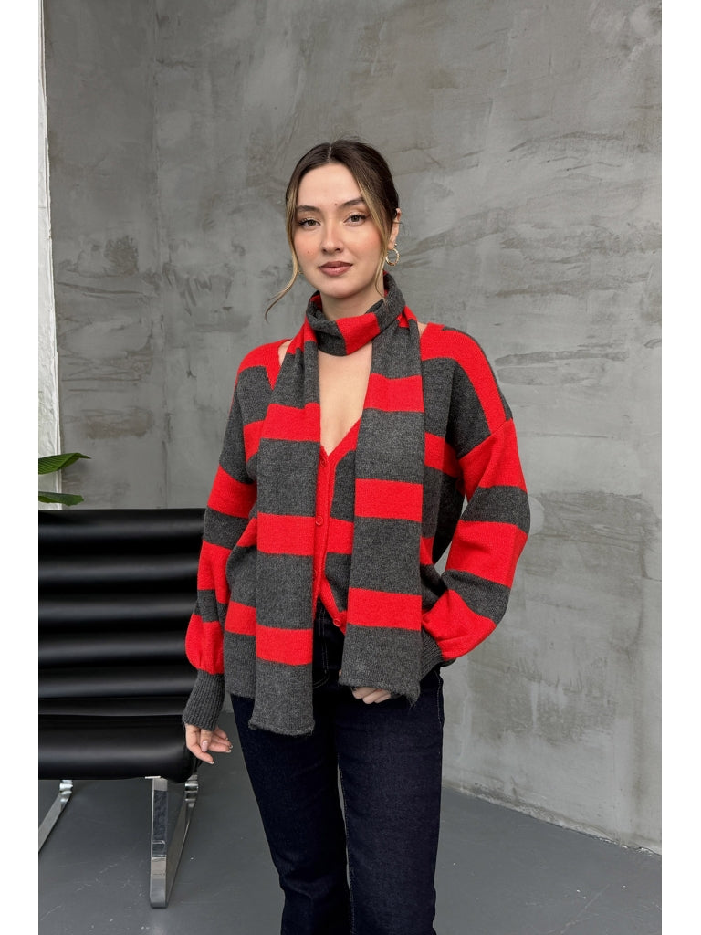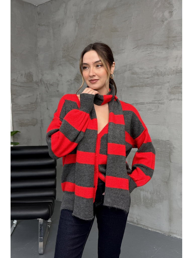 Kırmızı Çizgili Atkılı Hırka 2569-Kırmızı