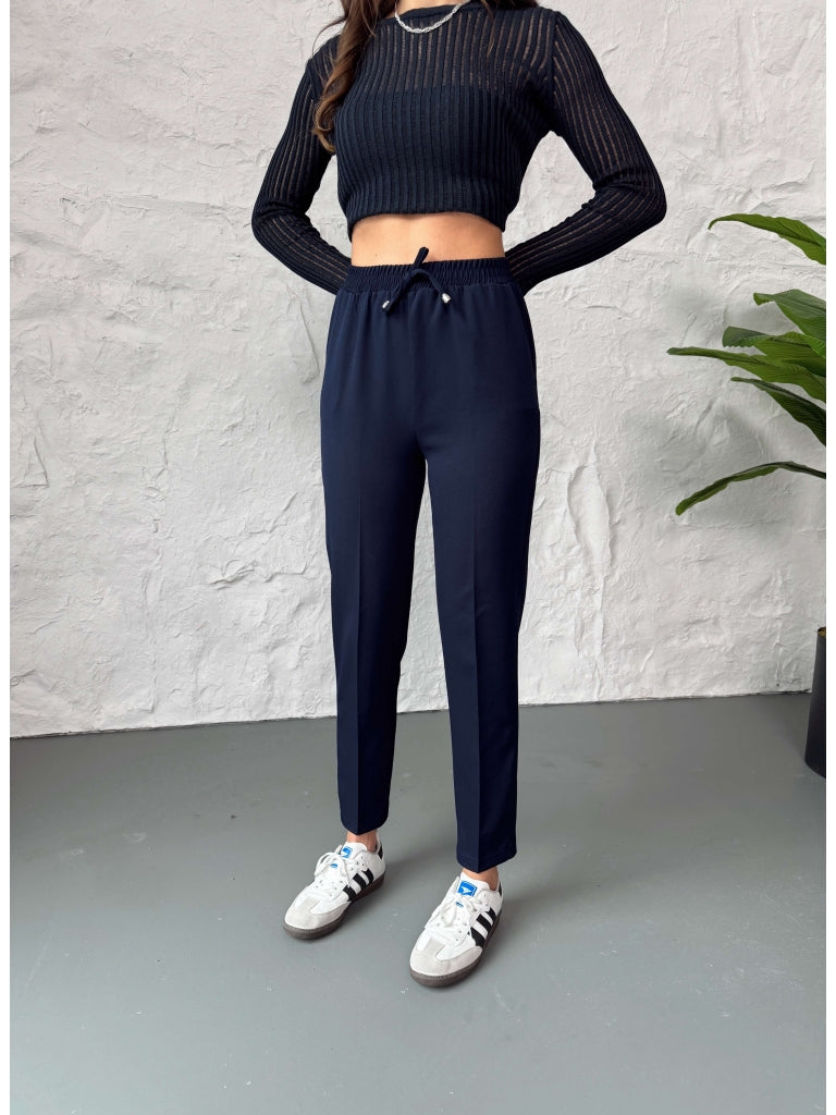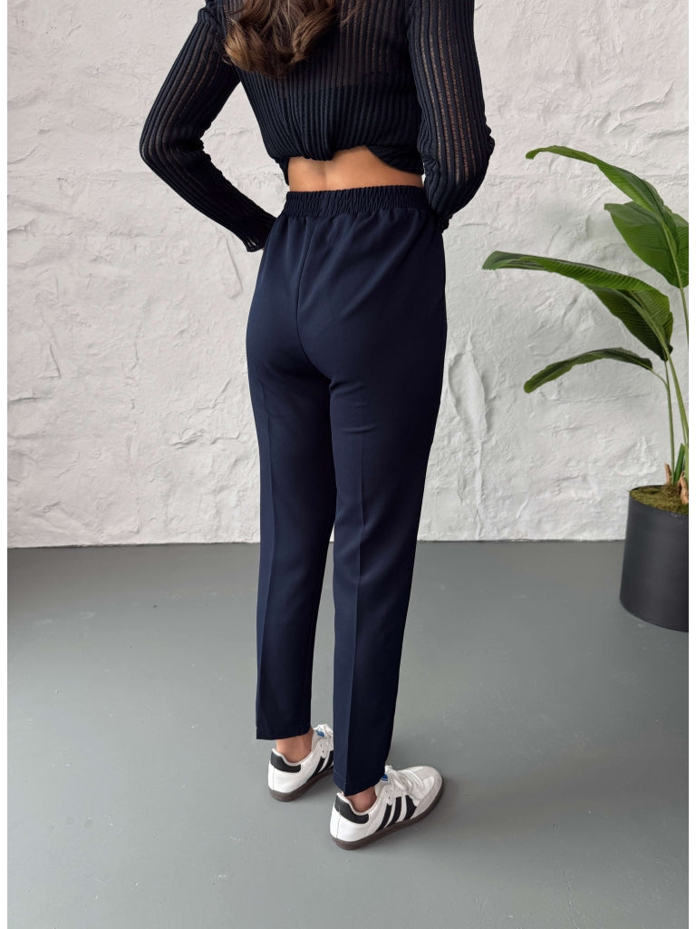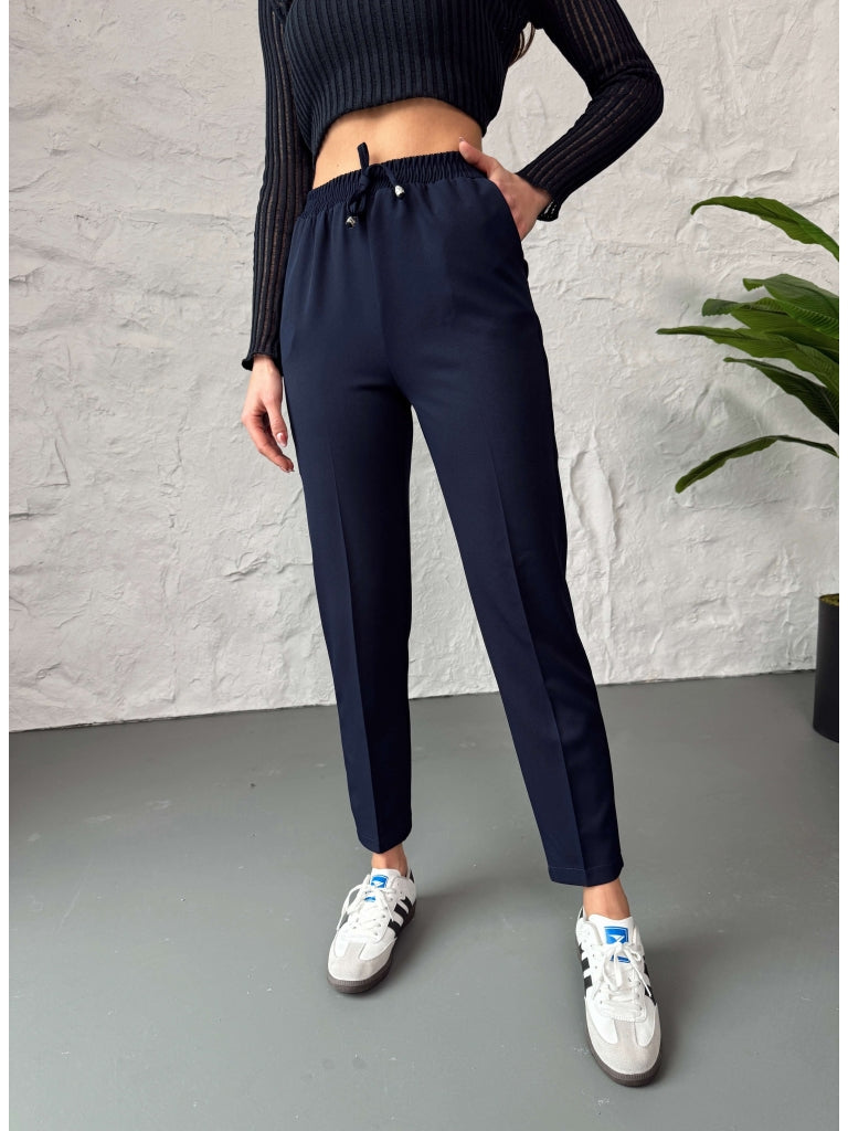 Lacivert bel lastikli havuç pantolon, modern ve şık bir kesime sahiptir, bu sayede rahat bir kullanım sunar. Farklı üstlerle kombinlenerek hem gündelik hem de şık bir görünüm elde etmenizi sağlar. Yumuşak dokusu sayesinde gün boyu konforlu bir deneyim yaşarsınız.