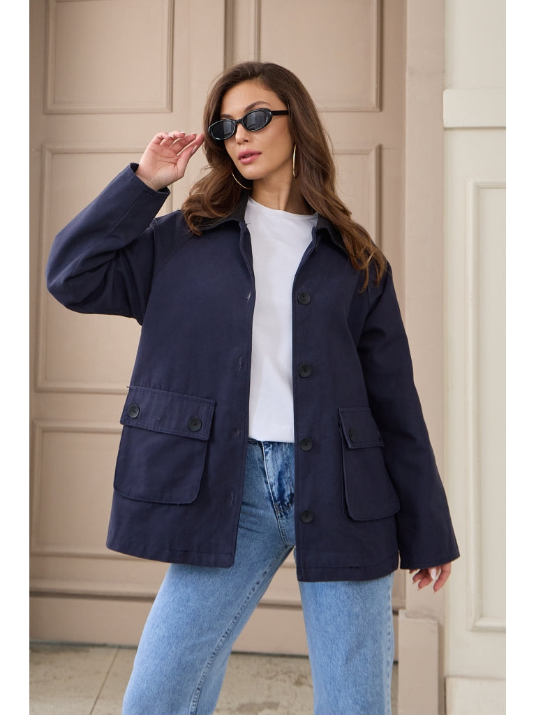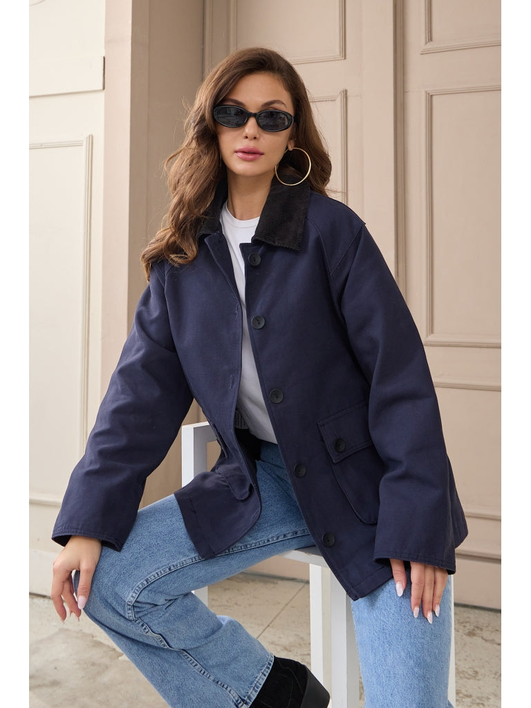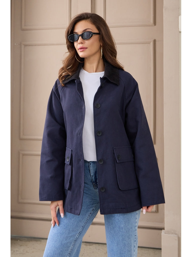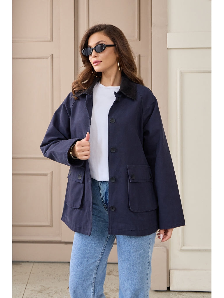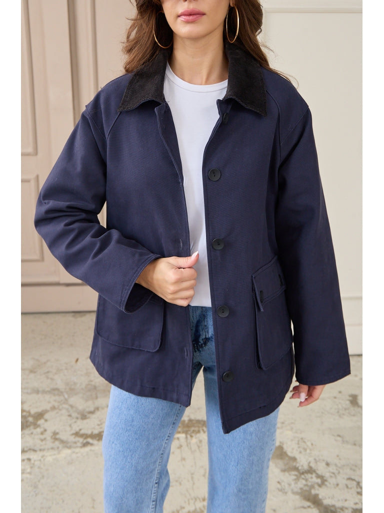 • Lacivert Kadife Yakalı Kanvas Ceket