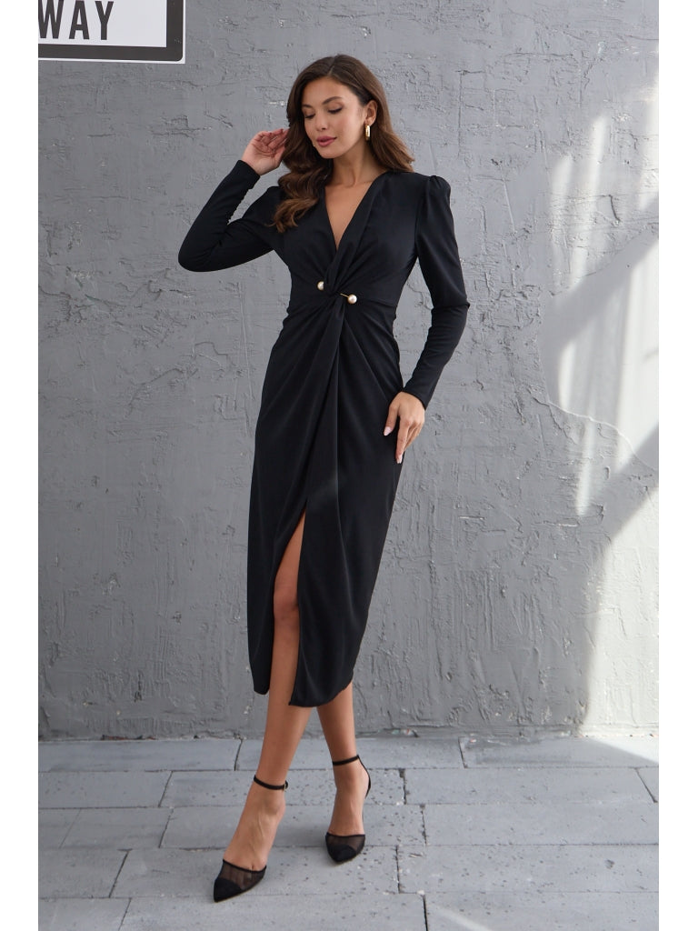 Siyah İnci Aksesuarlı Vatkalı Elbise