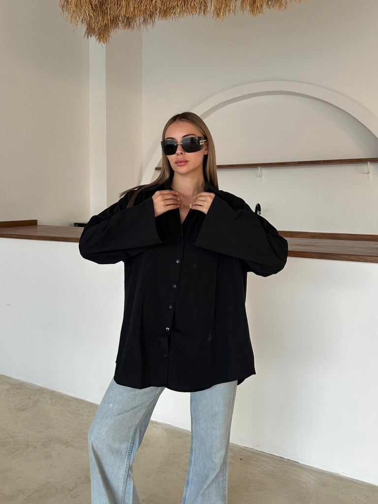 Siyah İspanyol Kol Oversize Cep Detaylı Gömlek