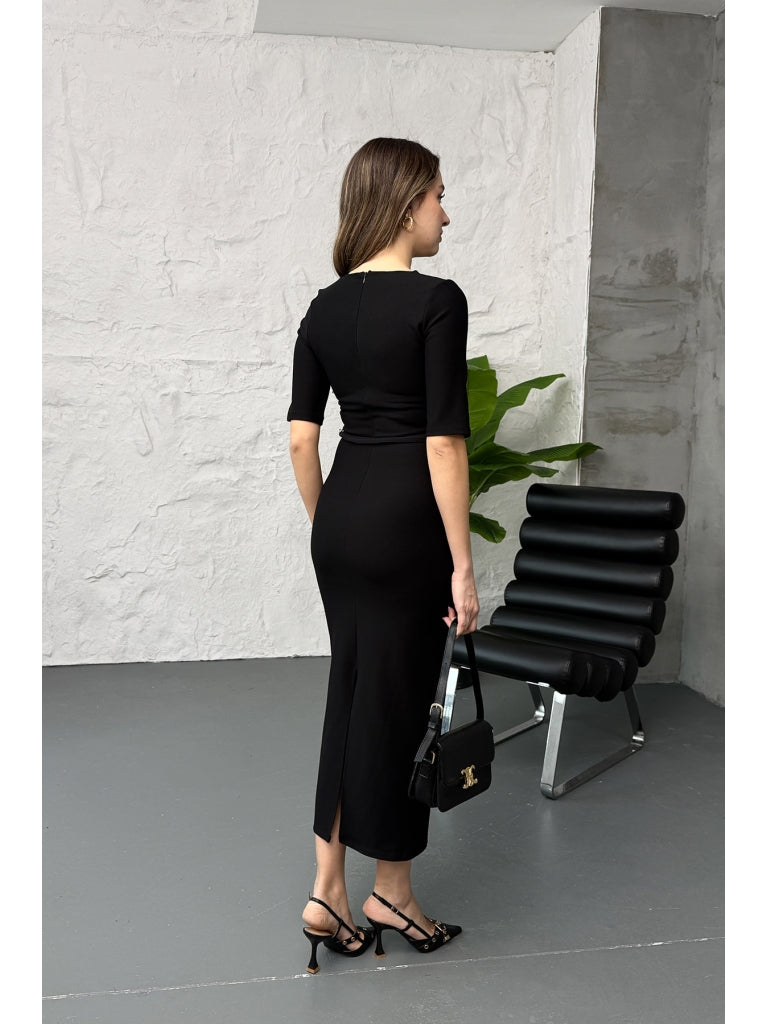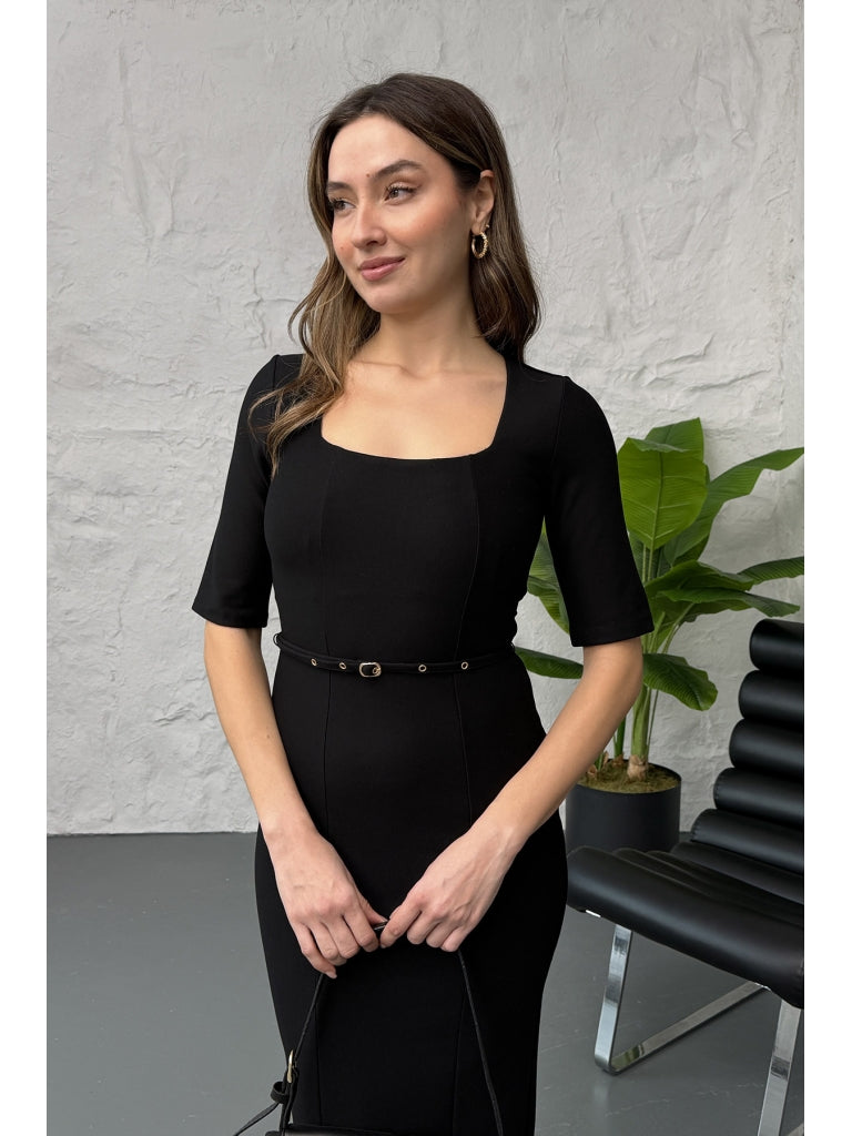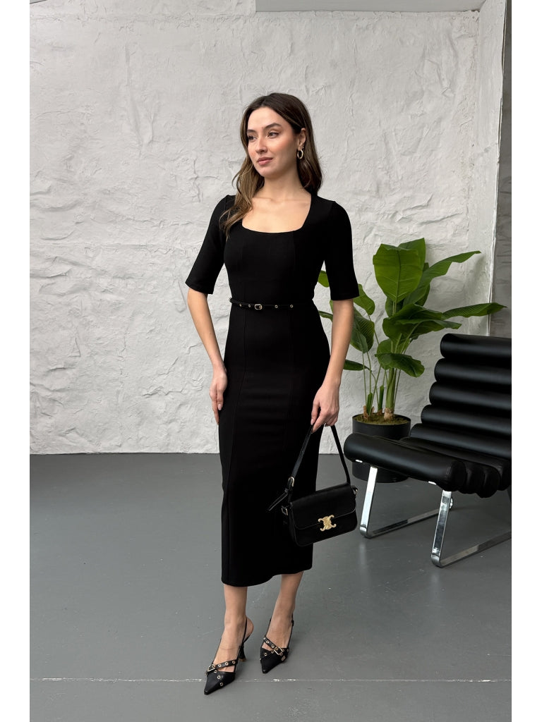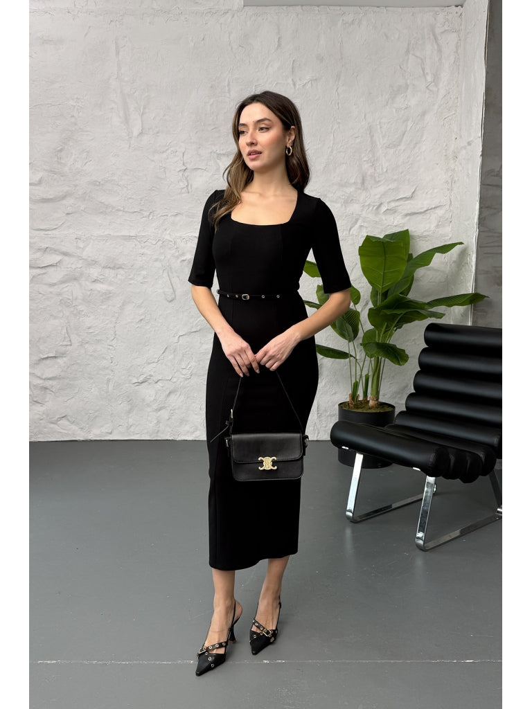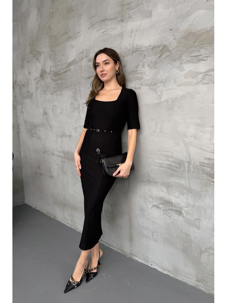 Siyah Kare Yaka Kemerli Maxi Elbise 1271-Siyah