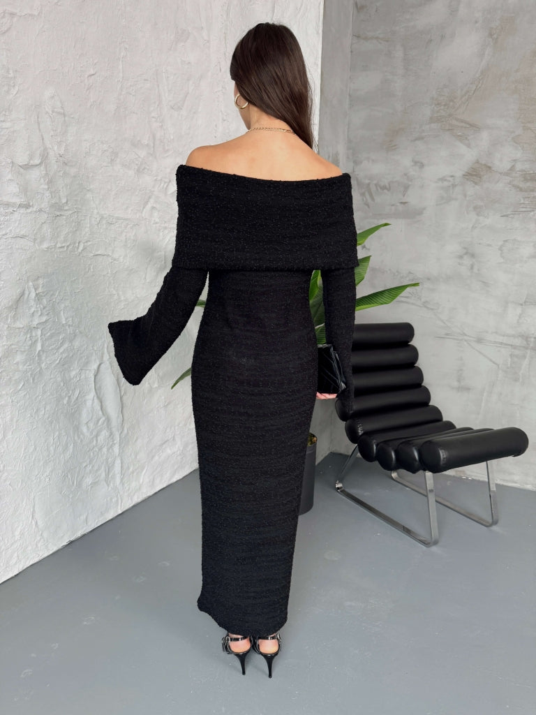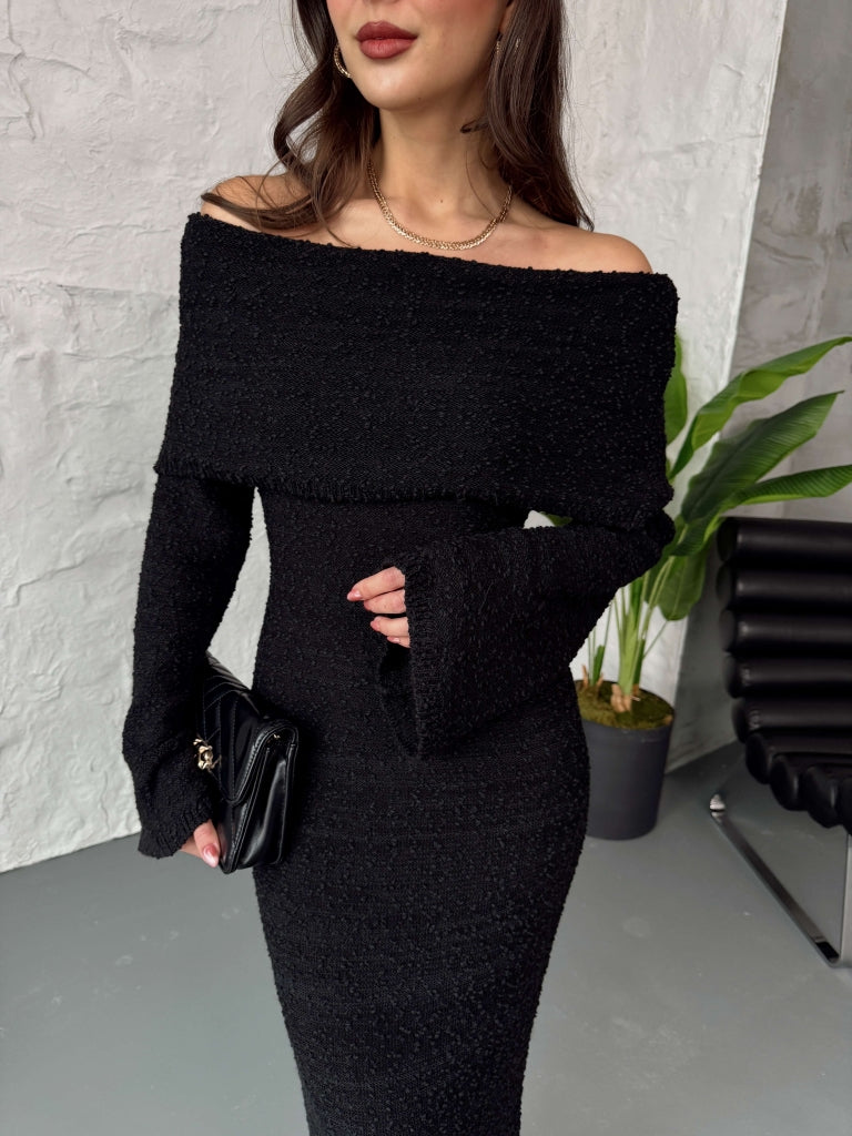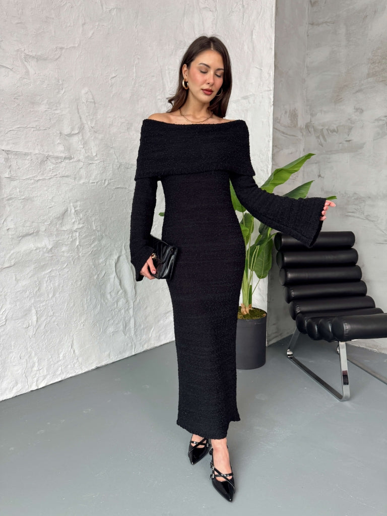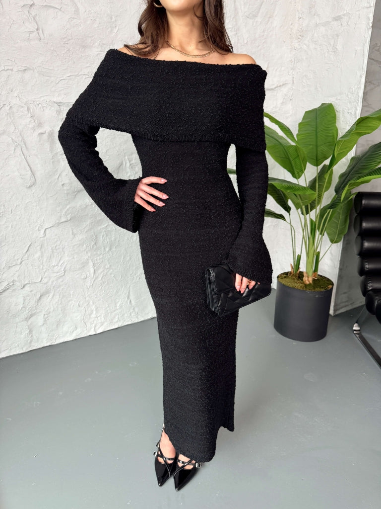 Siyah Madonna Yaka Dokulu Triko Elbise, şıklığı ve rahatlığı bir araya getiren zarif bir parçadır. Off-shoulder tasarımı, modern bir görünüm sunarak boynu vurgular. Yumuşak dokusu sayesinde gün boyu konfor sağlar. Uzun kollu ve maxi boyu ile her mevsim kullanılabilir bir seçenek oluşturur. Bu elbiseyi spor ayakkabılarla ya da şık topuklularla kombinleyerek farklı stiller yaratabilirsiniz.