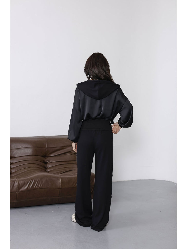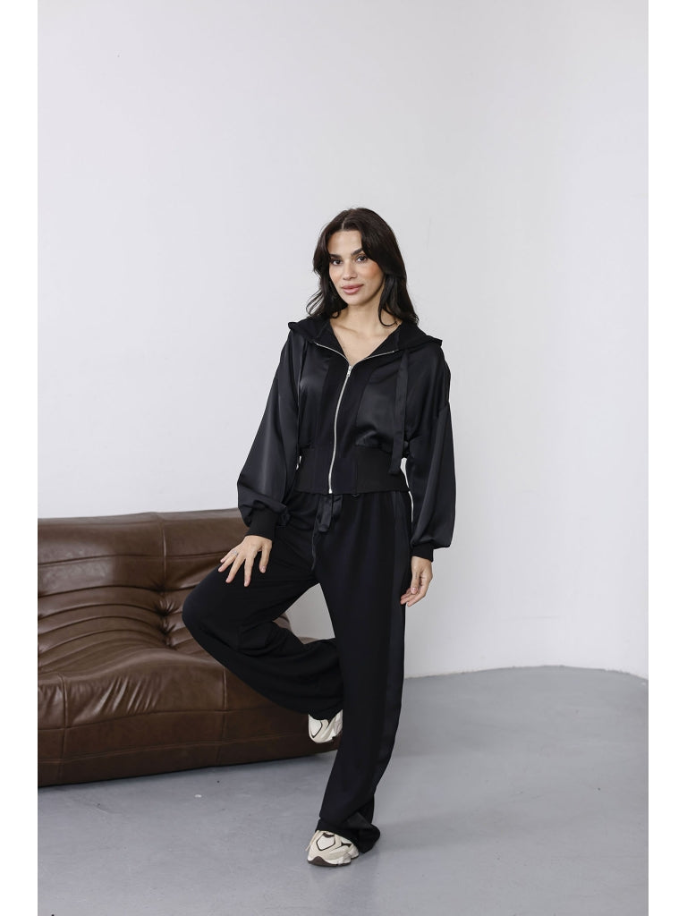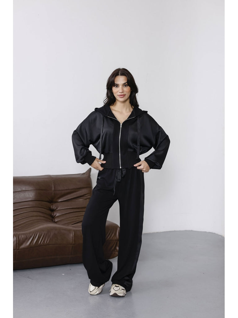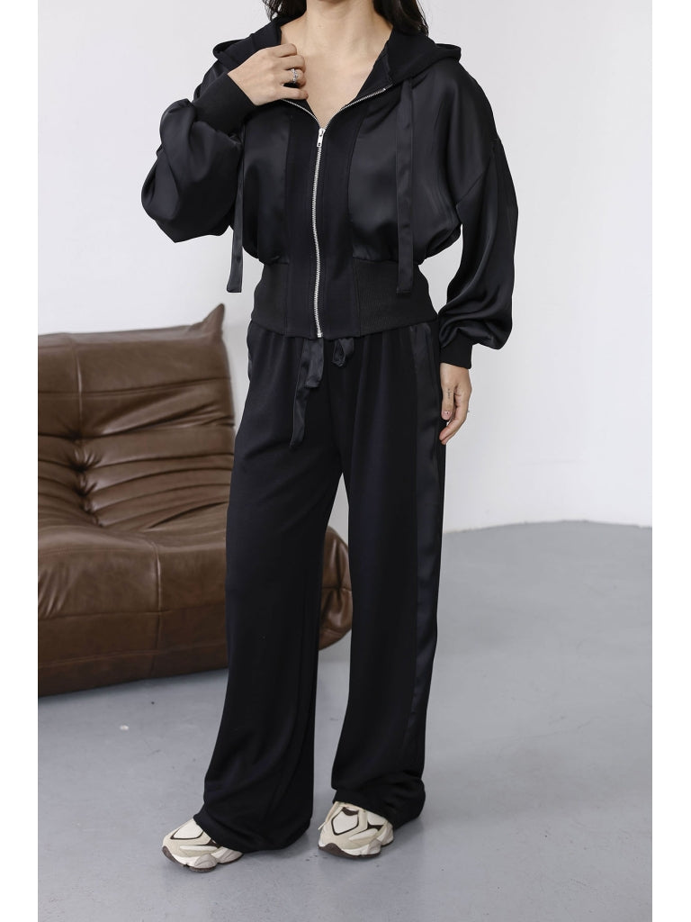 Siyah Saten Detaylı Fermuarlı Takım 2101-Siyah