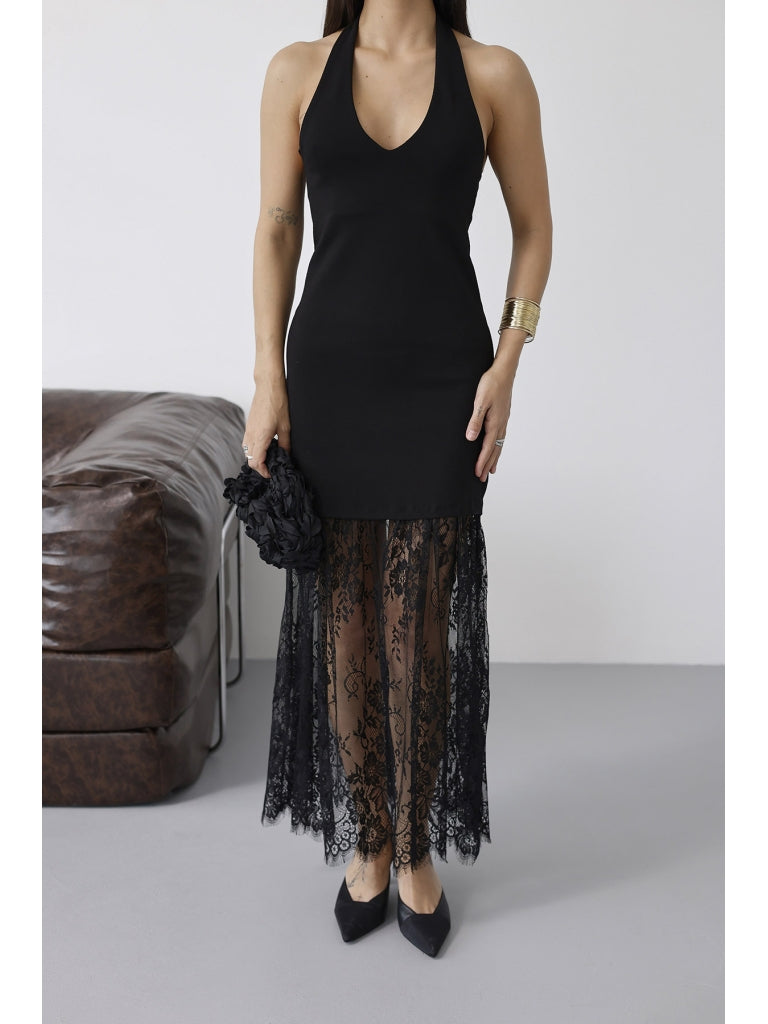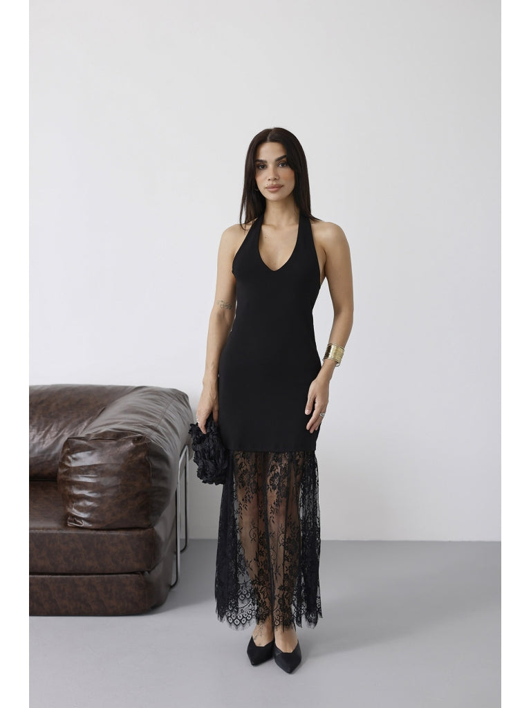 Siyah Sırt Dekolteli Dantel Detay Elbise 4106-Siyah