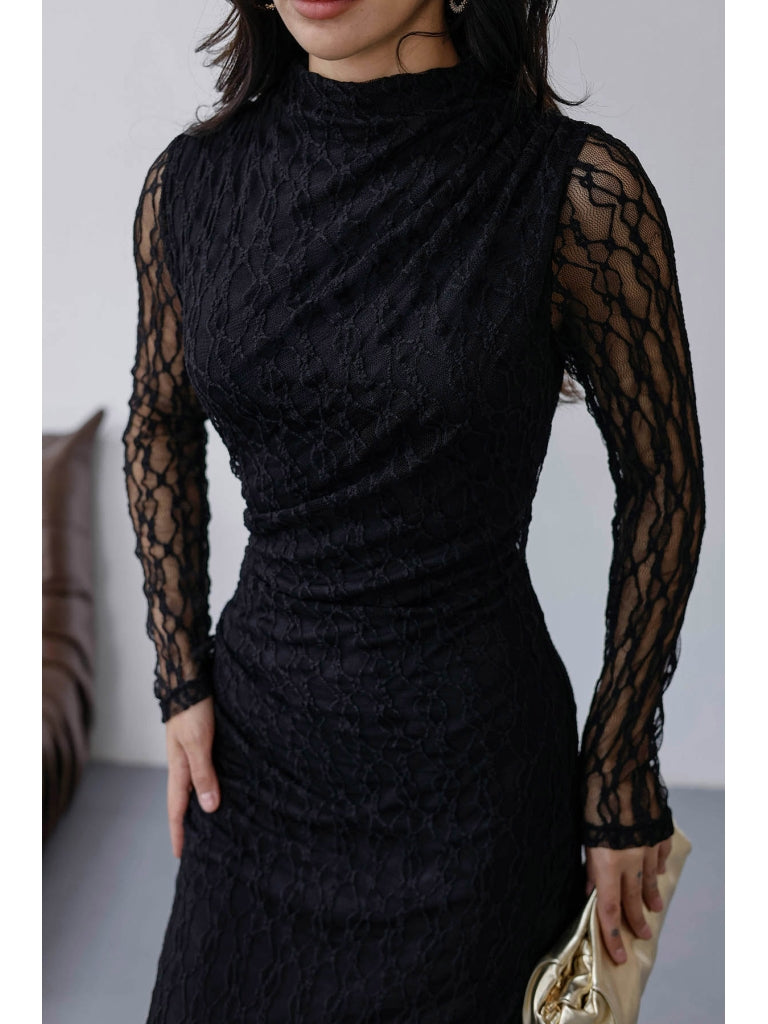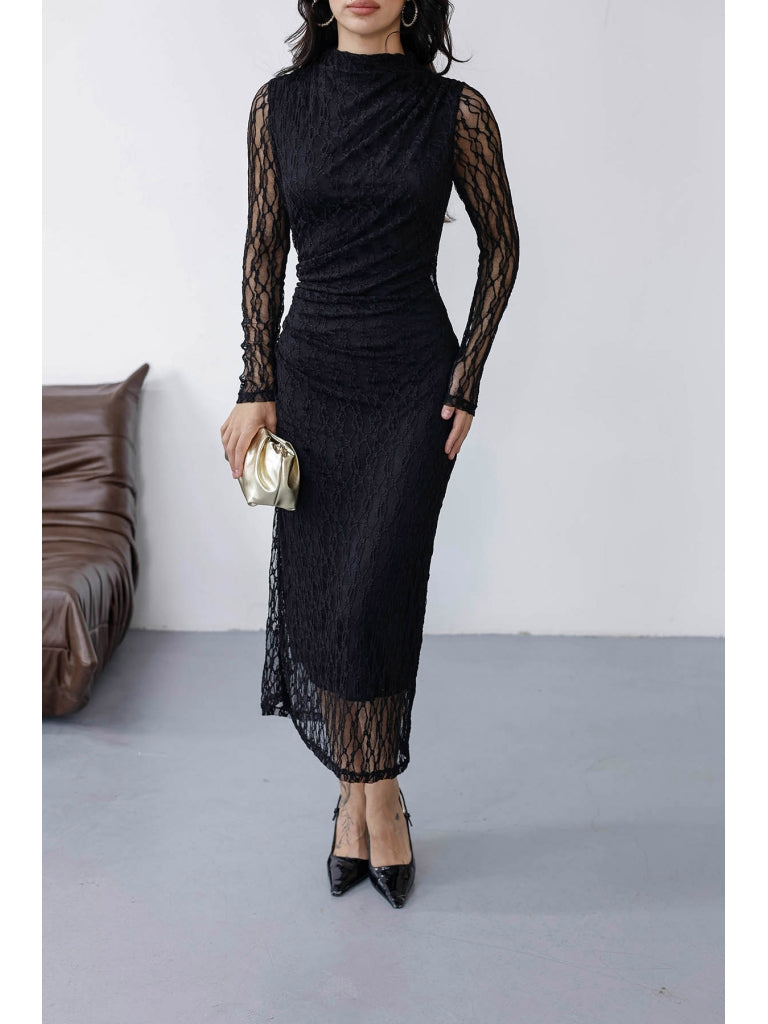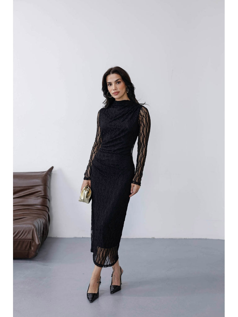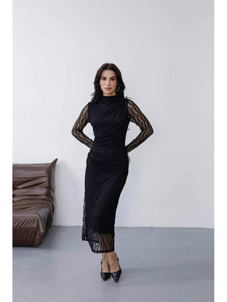 Siyah Yan Büzgülü Dantel Elbise 8249-Siyah