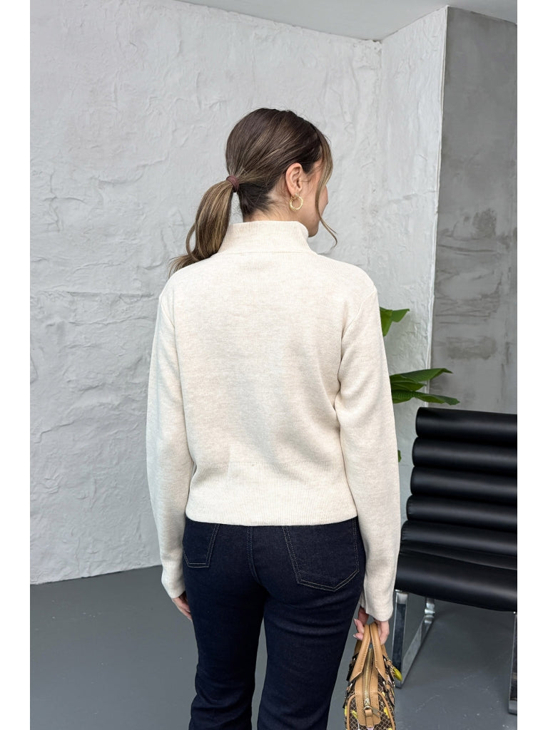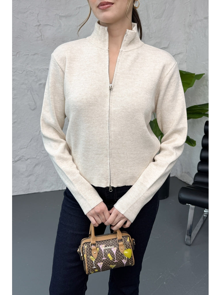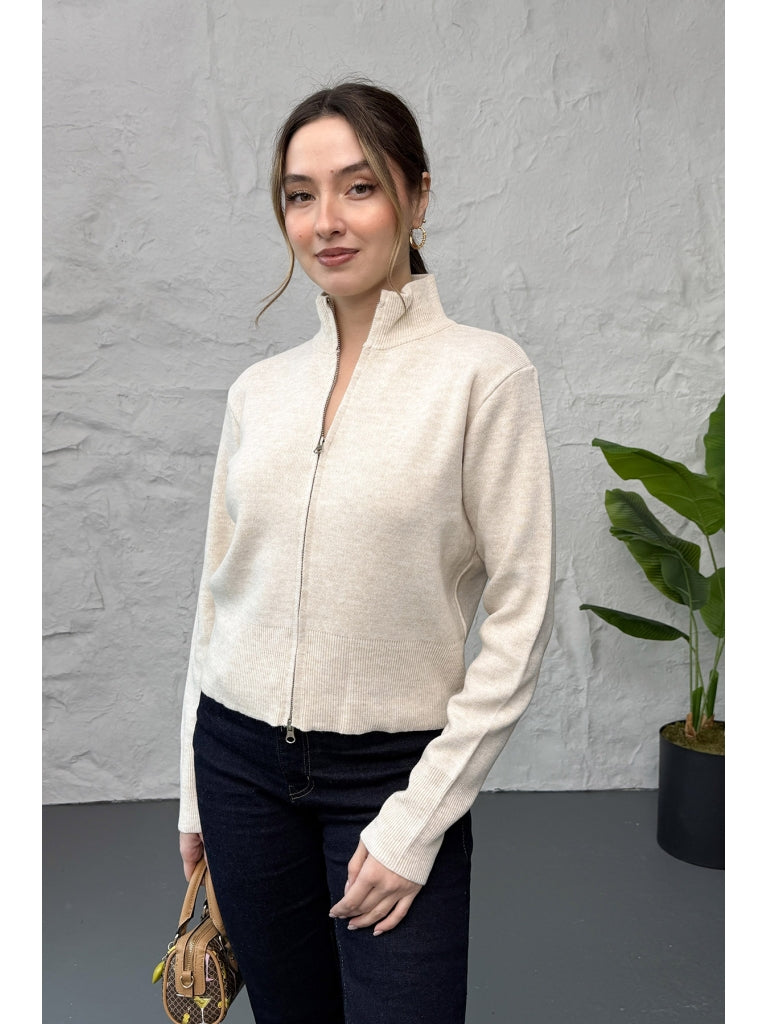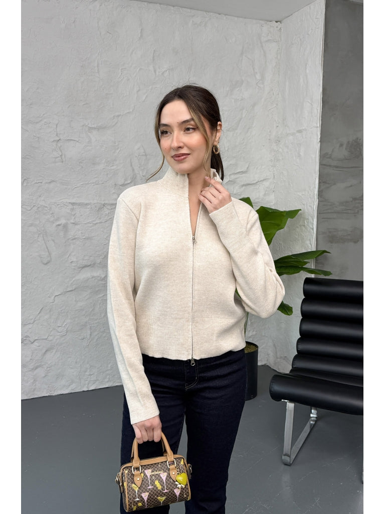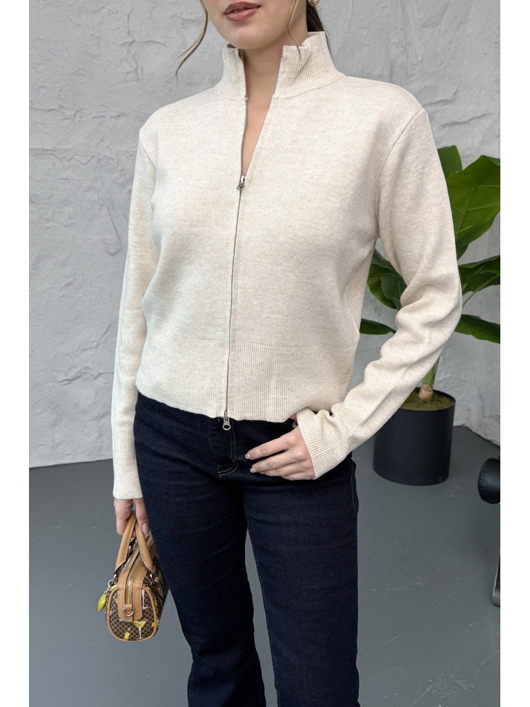 Taş Dik Yaka Fermuarlı Triko Hırka EY0009-TAŞ
