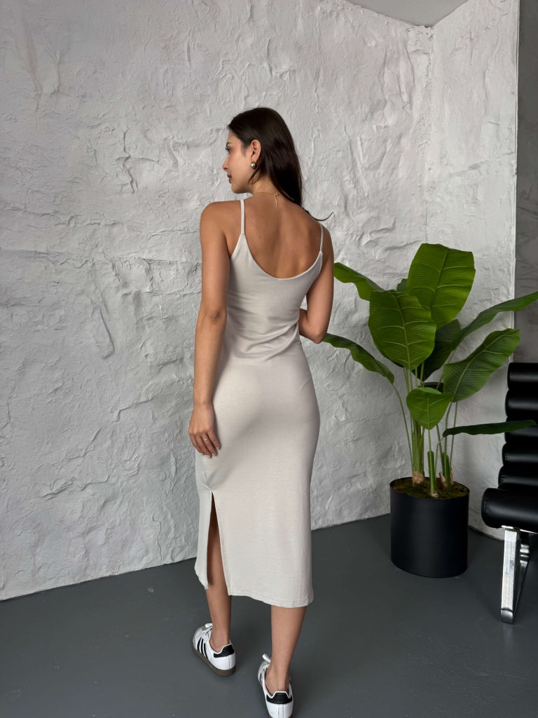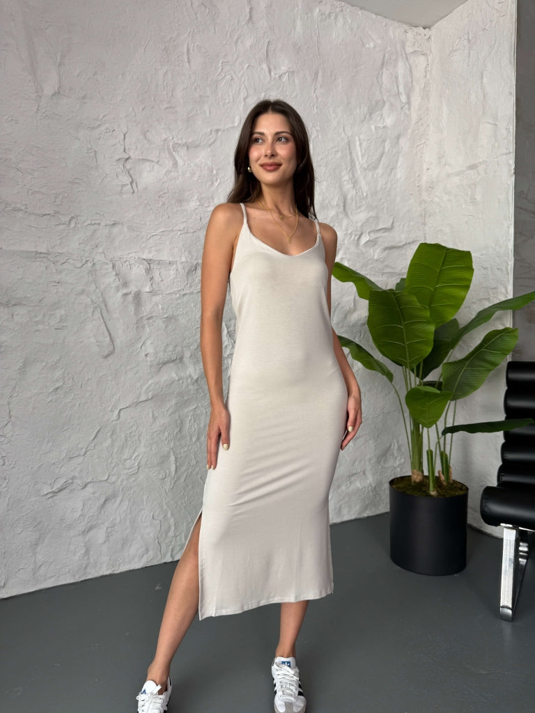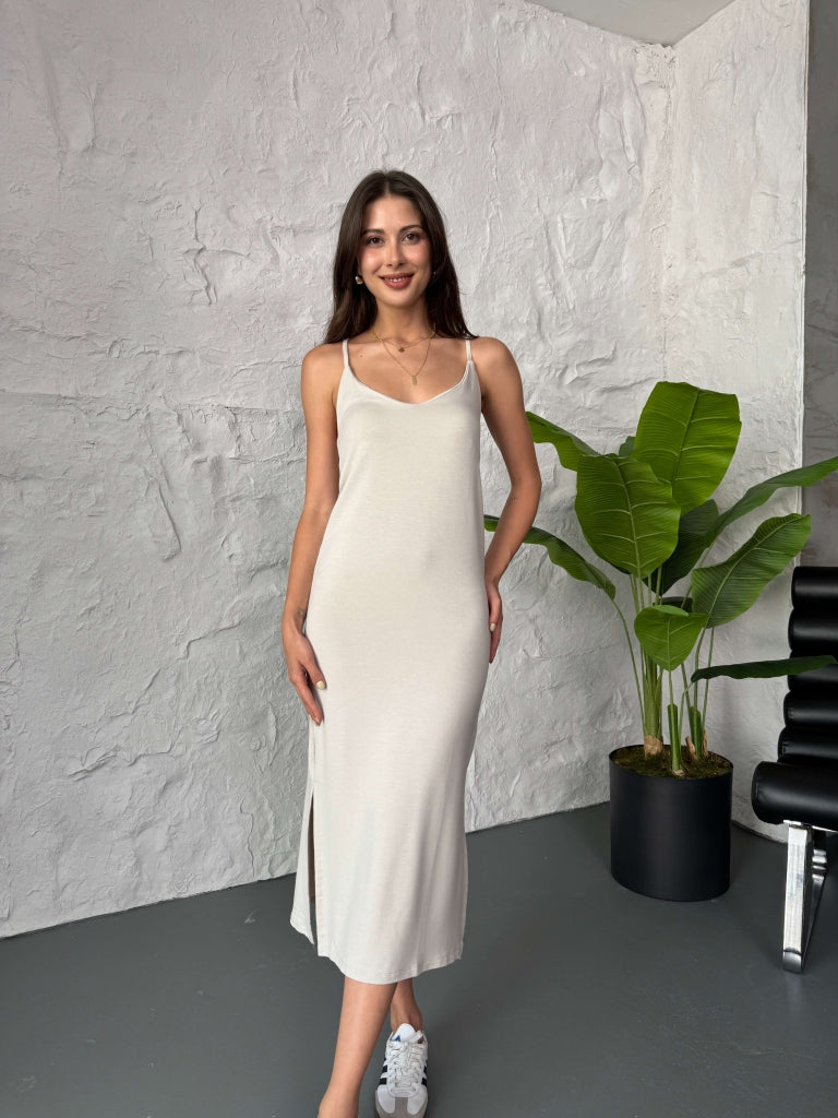 Taş İp Askılı Yırtmaçlı Modal Basic Elbise