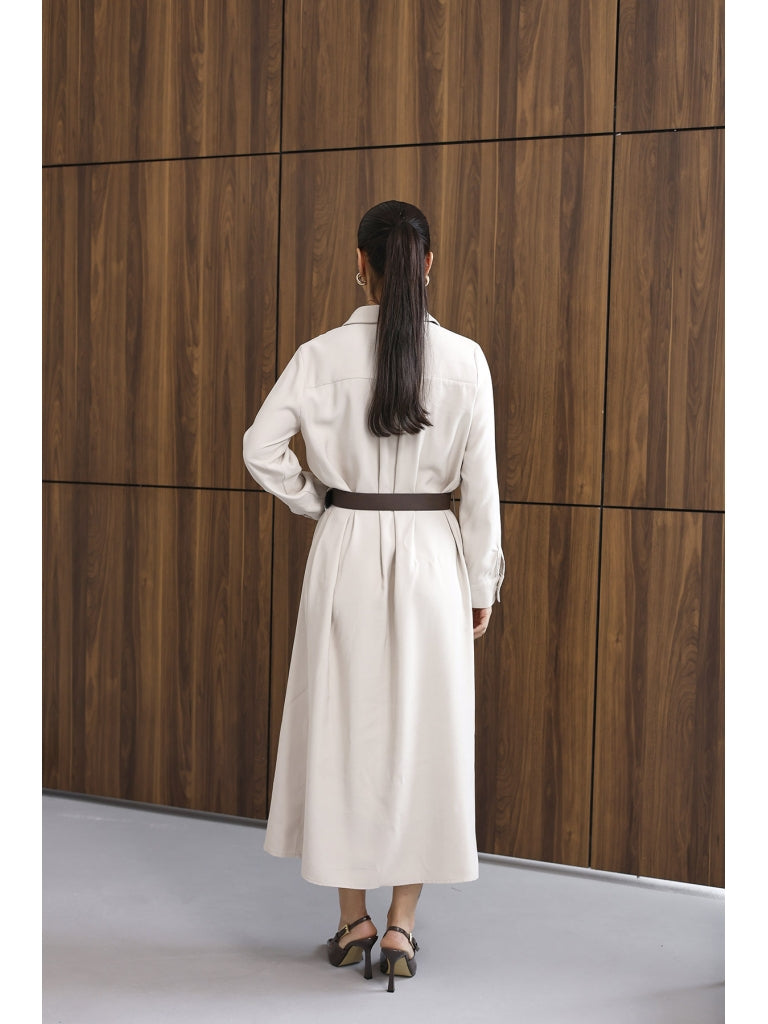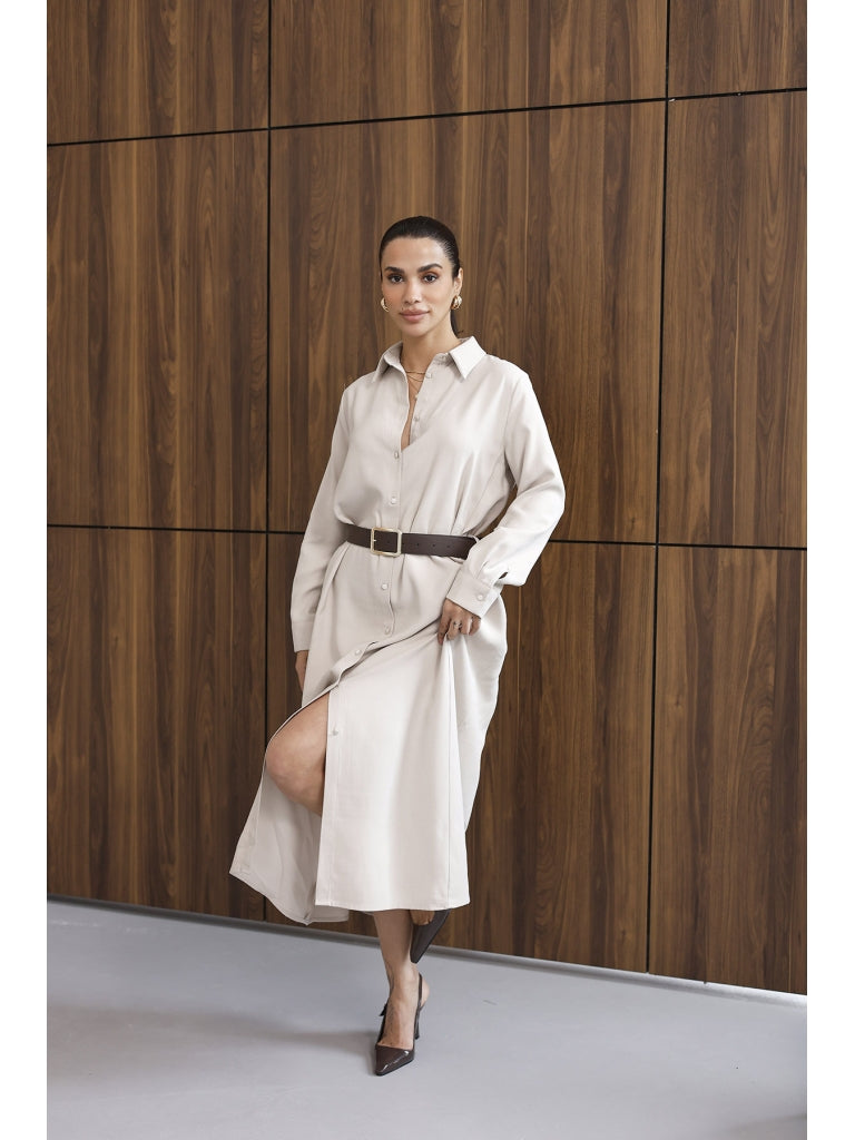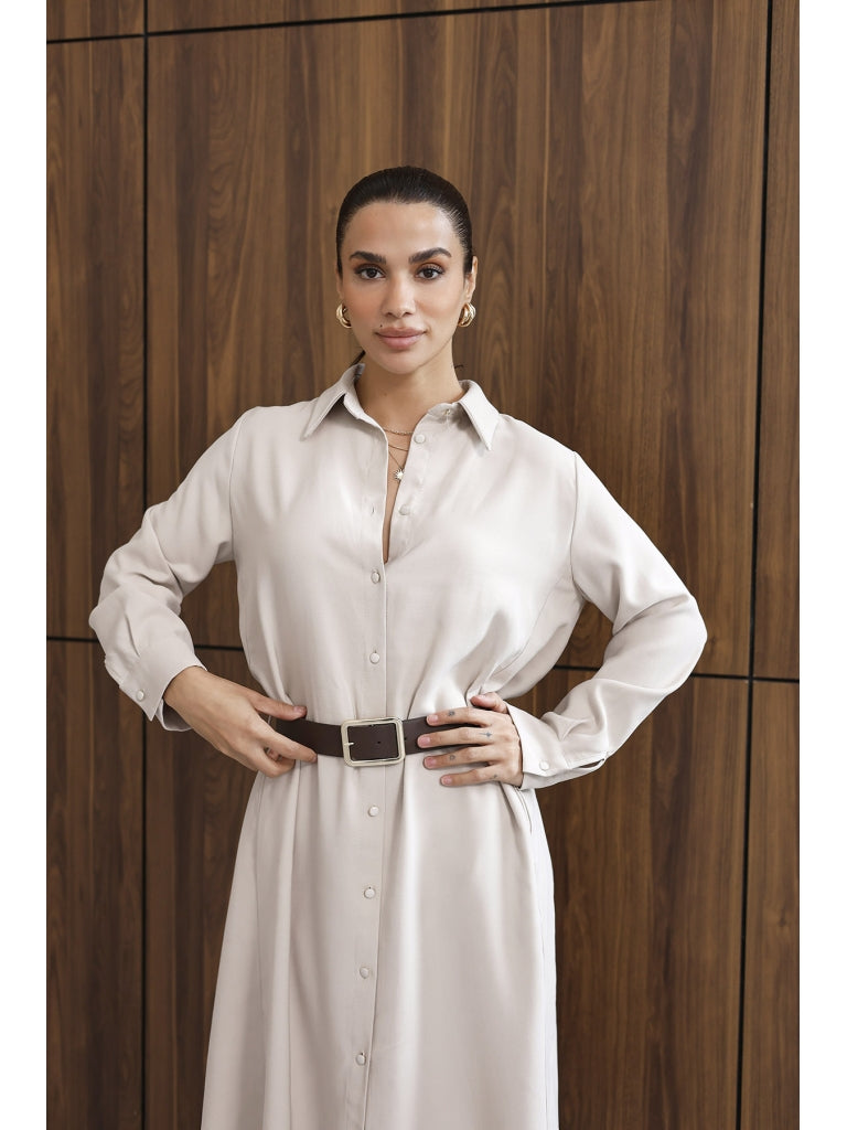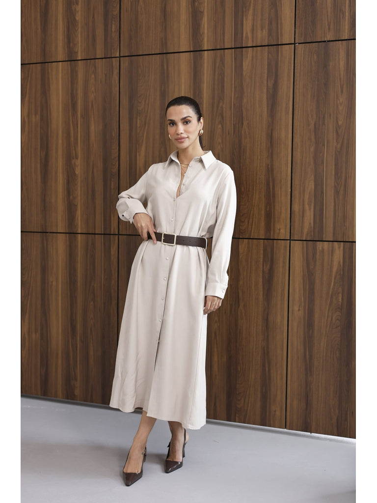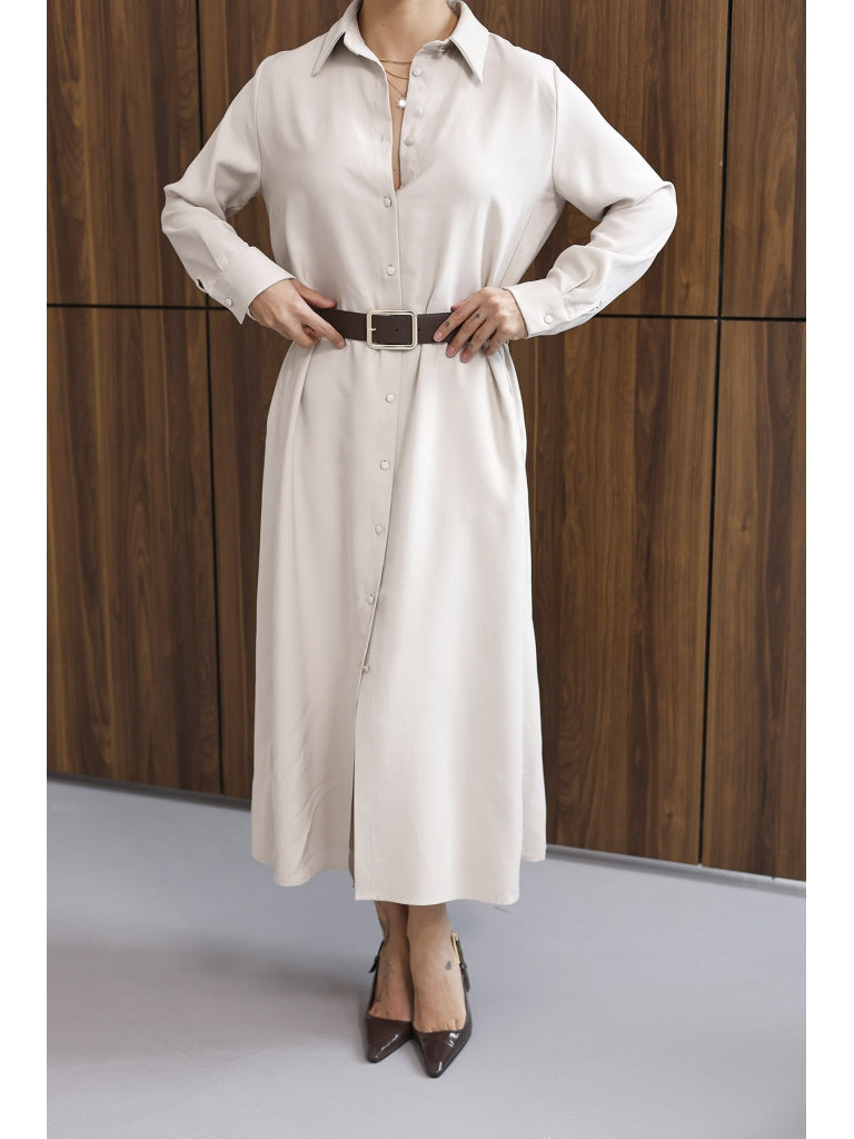 Taş Maxi Boydan Düğmeli Kemerli Elbise 8185-Taş