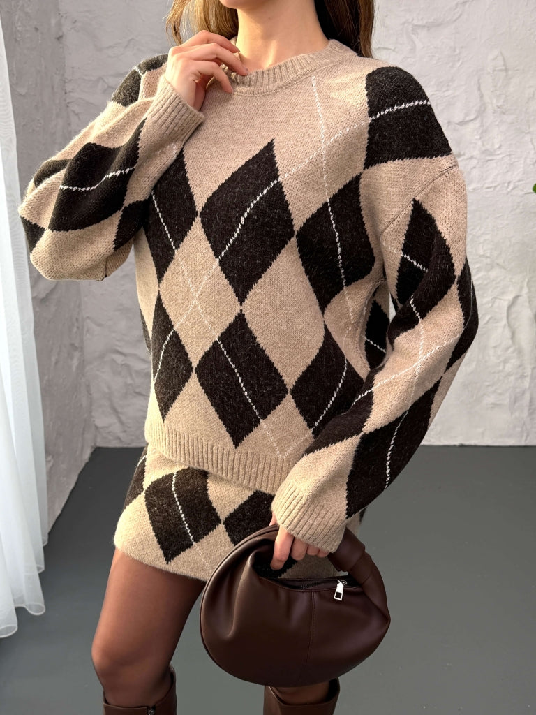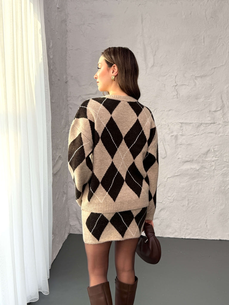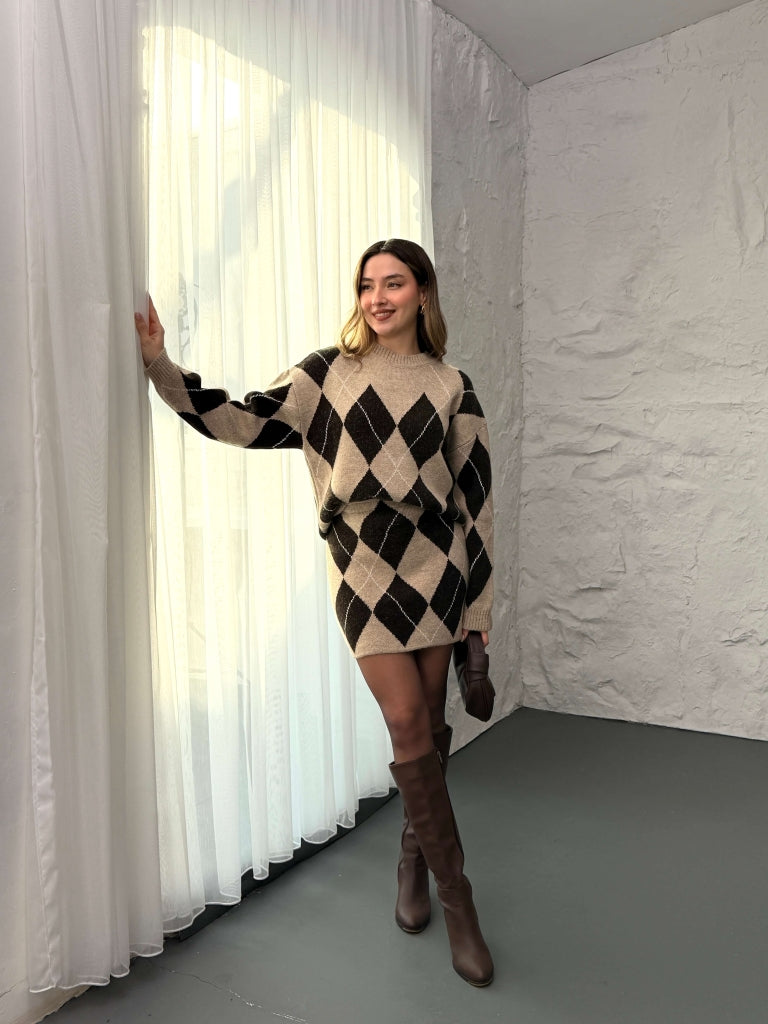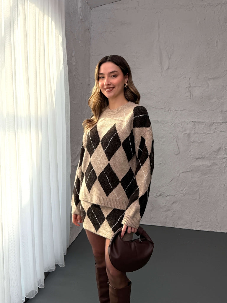 Vizon Baklava Desen Etek Kazak Takım 2575-Vizon