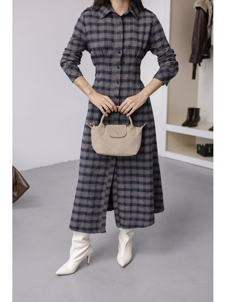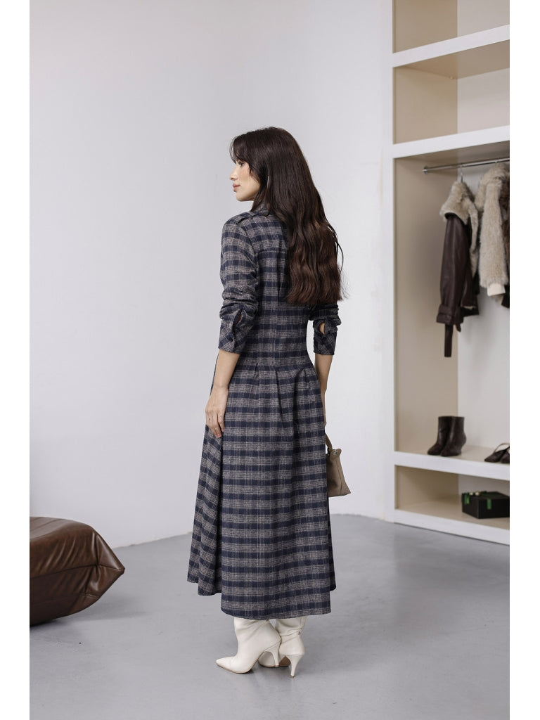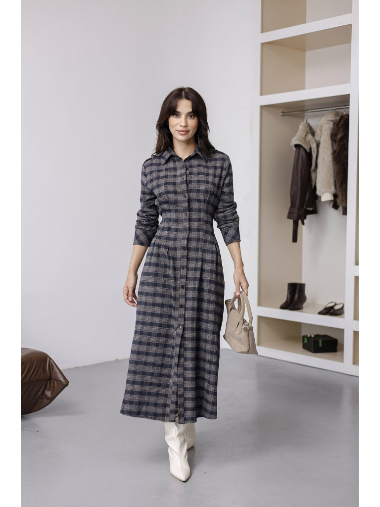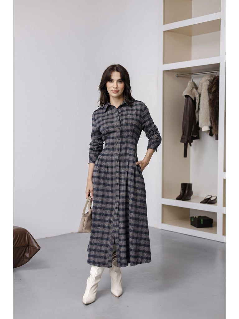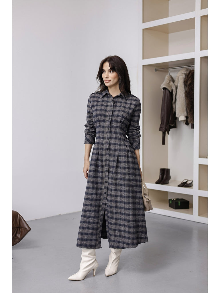 Vizon Lacivert Ekoseli Boydan Düğmeli Elbise 0745-Vizon