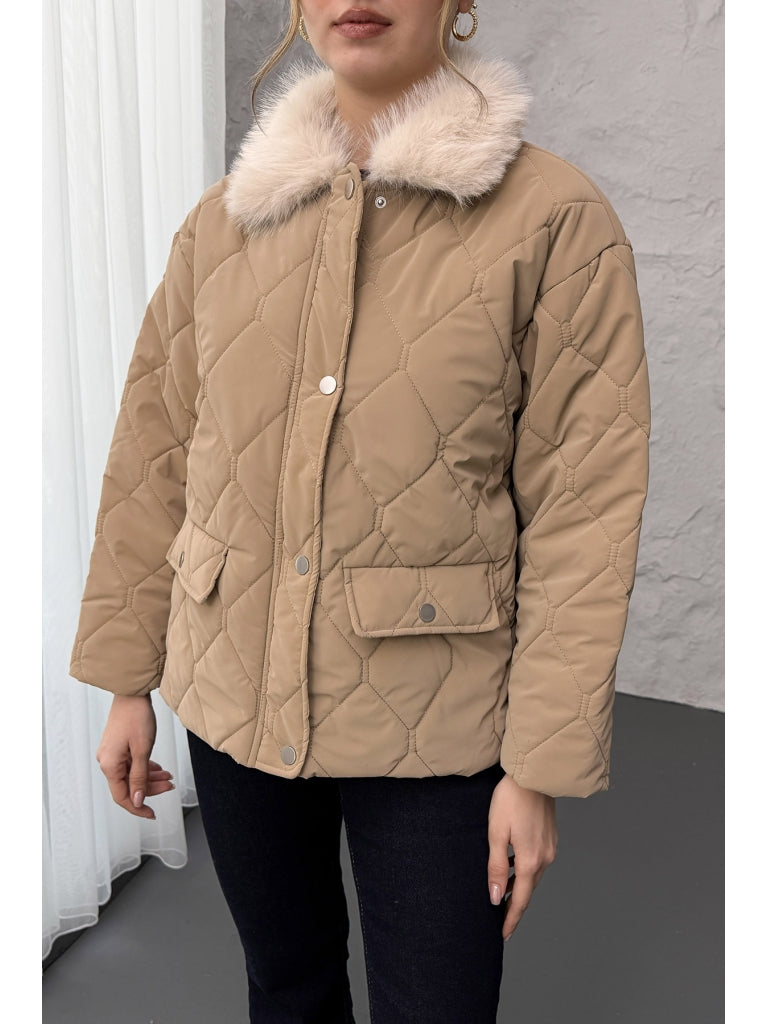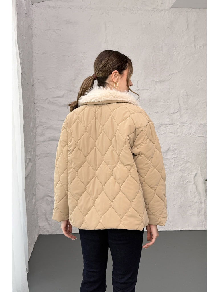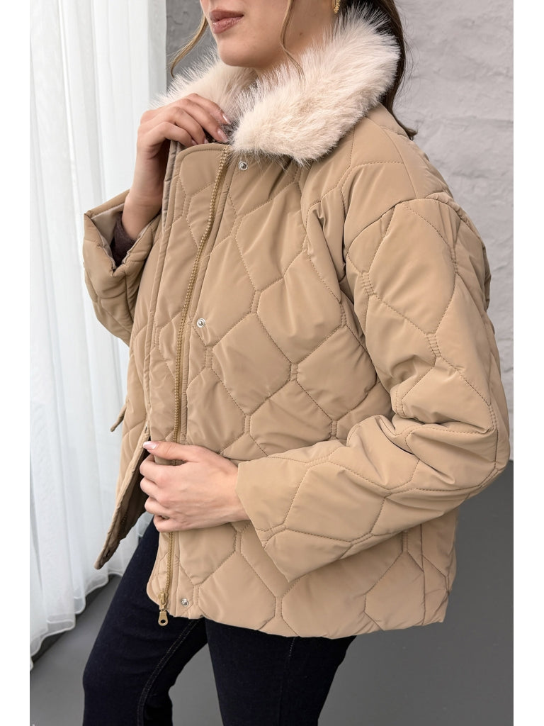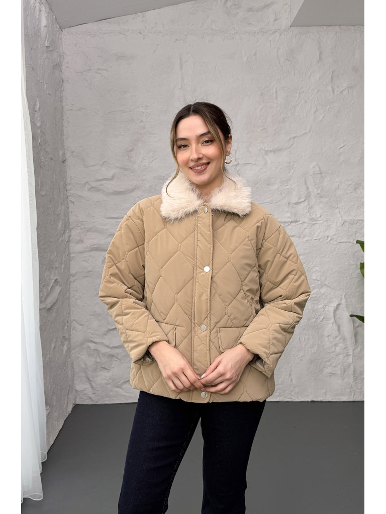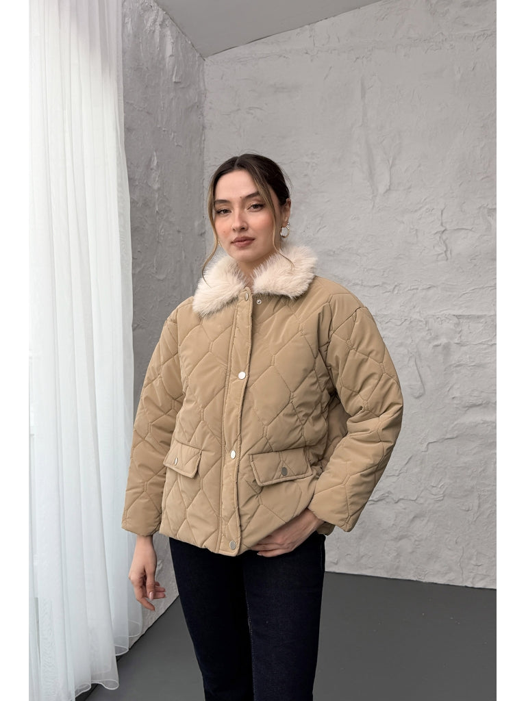 Vizon Yakası Kürklü Kapitone Mont 60559-Vizon