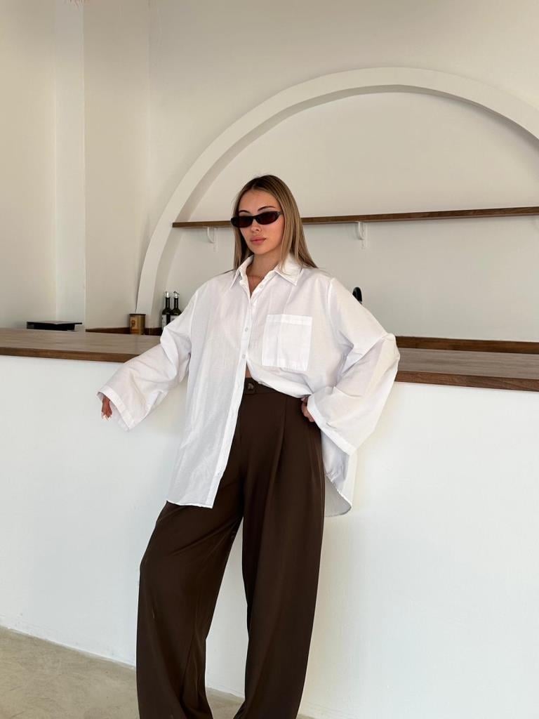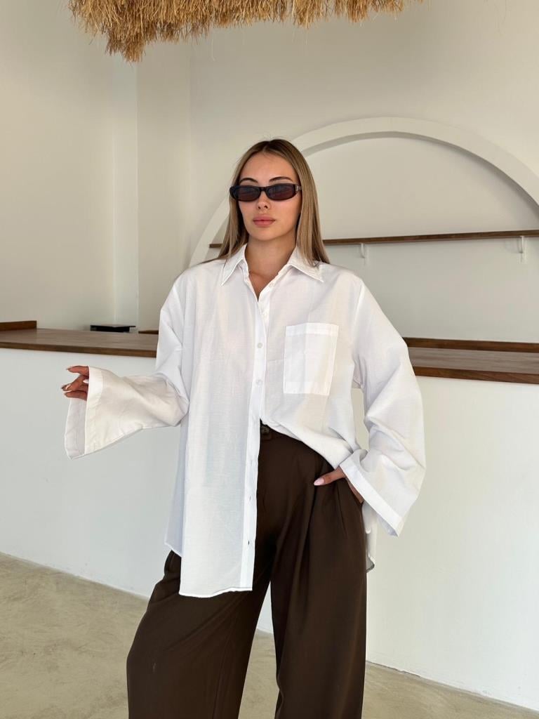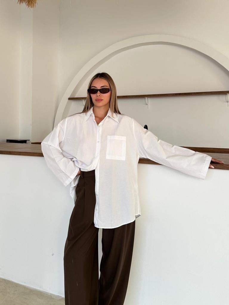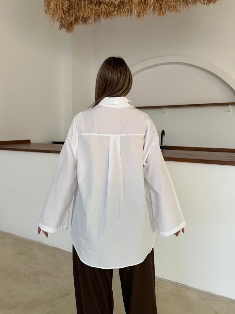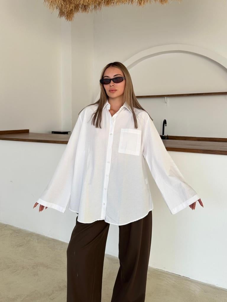 Beyaz İspanyol Kol Oversize Cep Detaylı Gömlek (2144-Beyaz)
