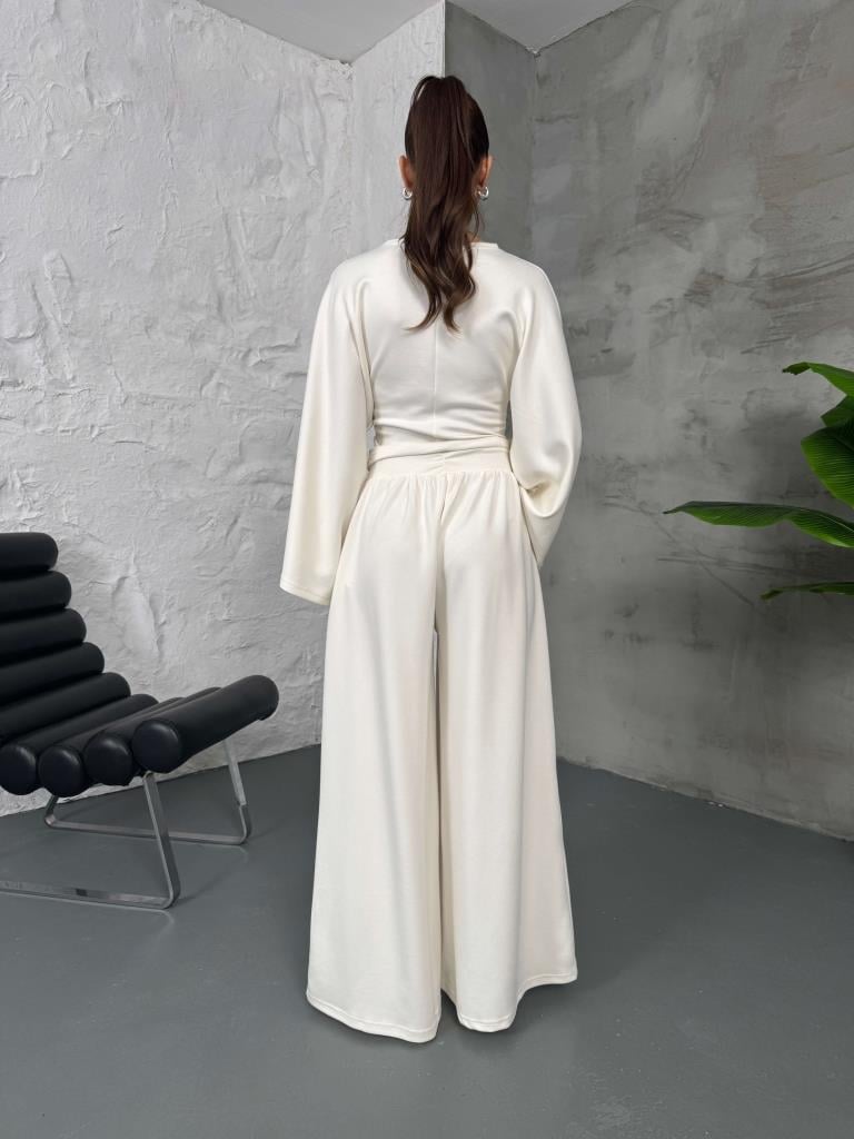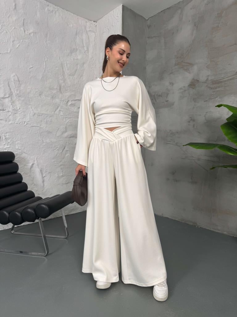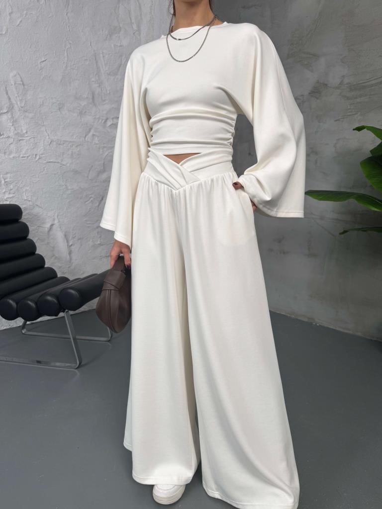 Beyaz Kemer Pileli Kolları Volanlı Takım (2136-Beyaz)
