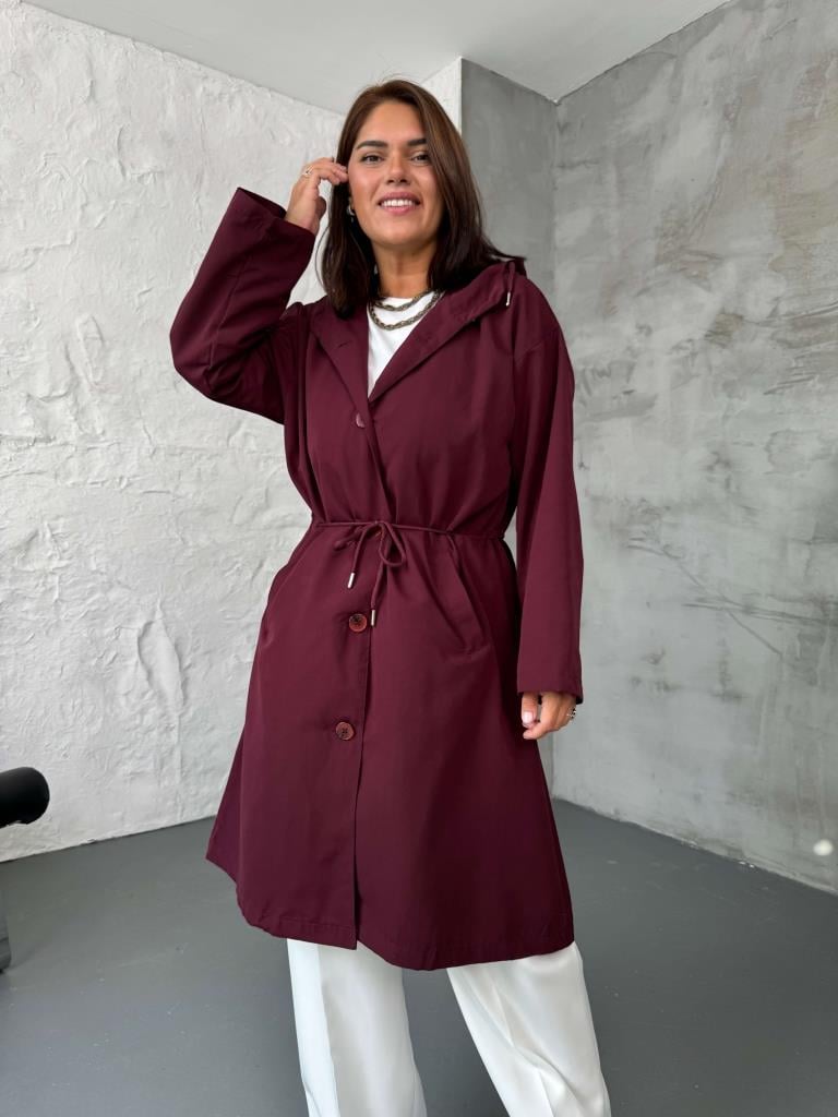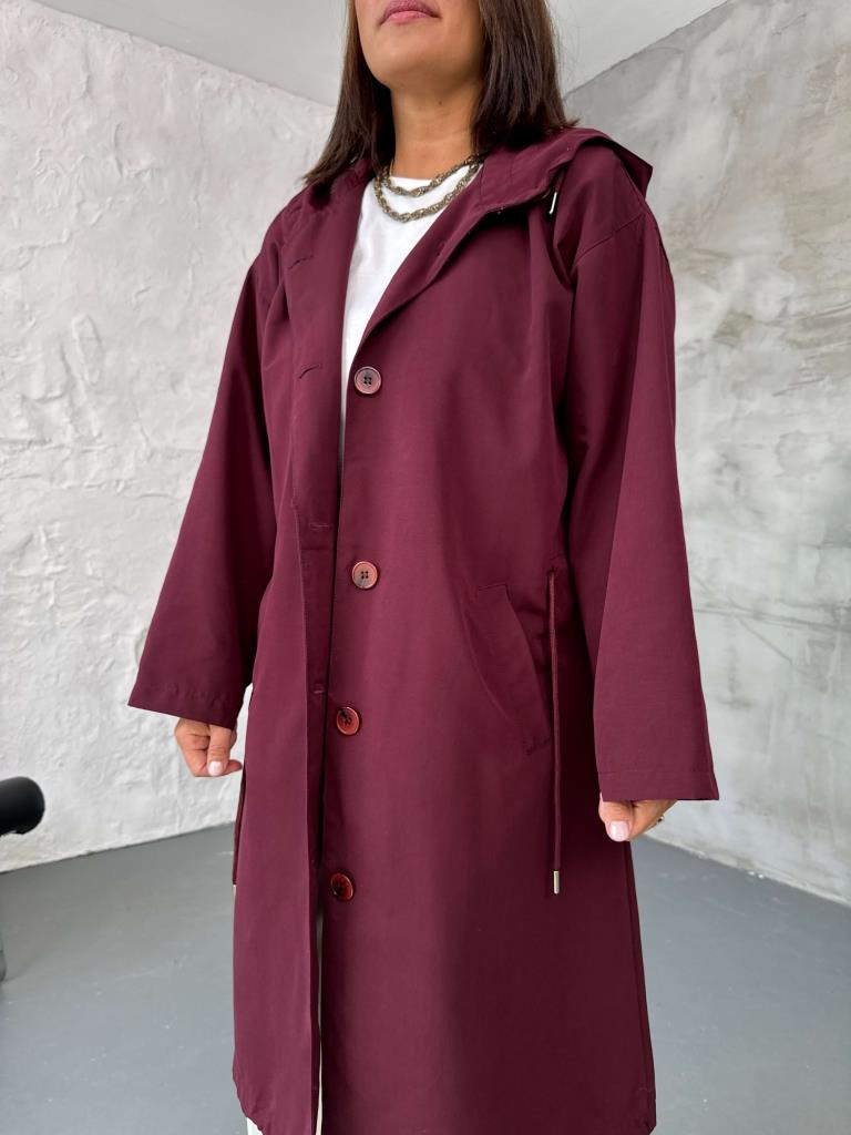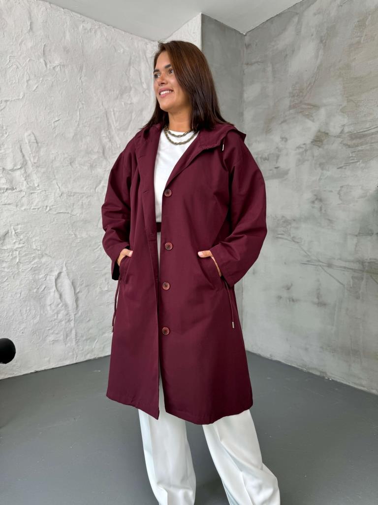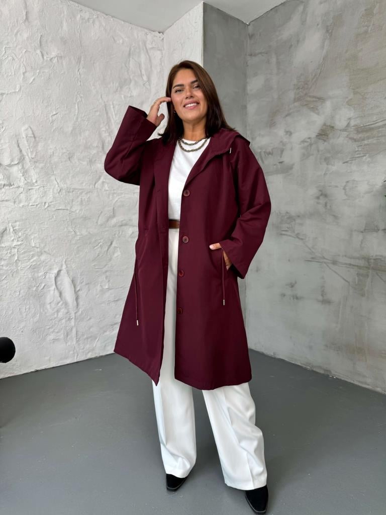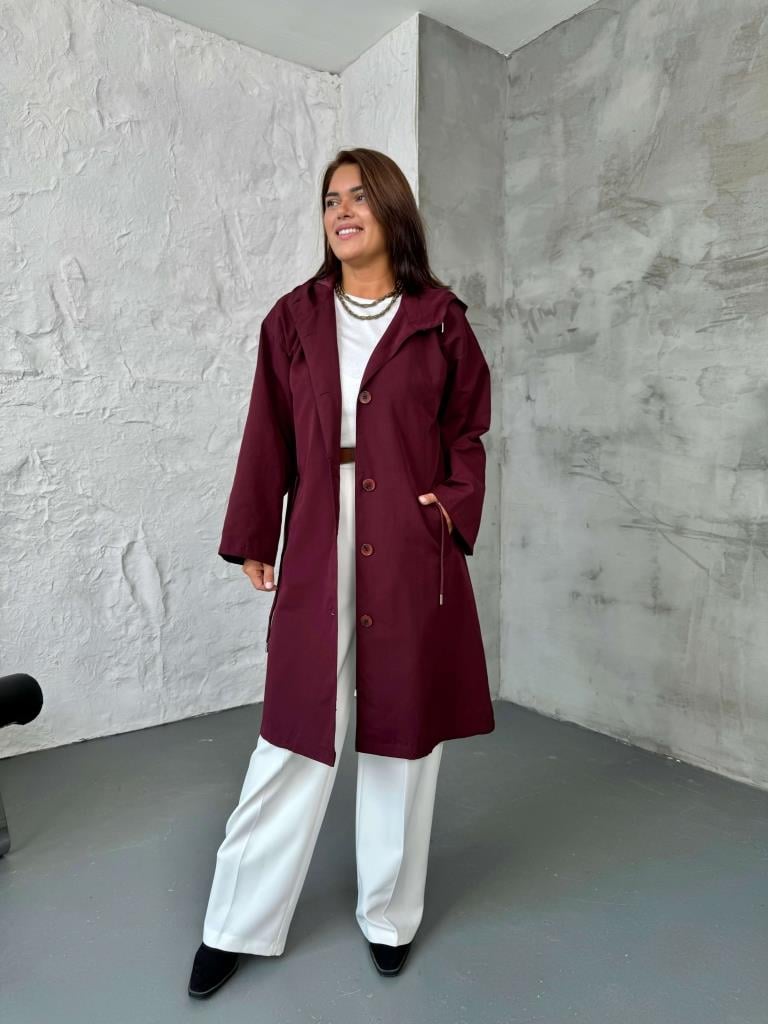 Bordo Kapşonlu Boydan Düğmeli Trenç (7024-Bordo)