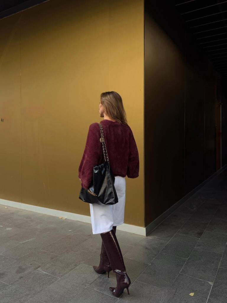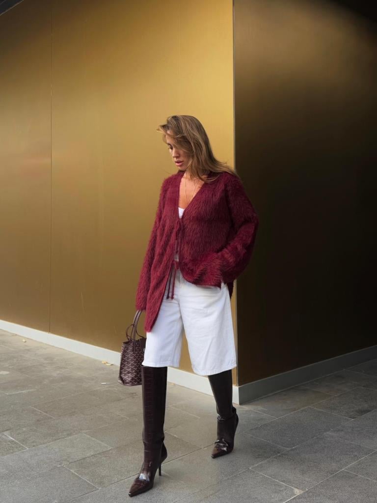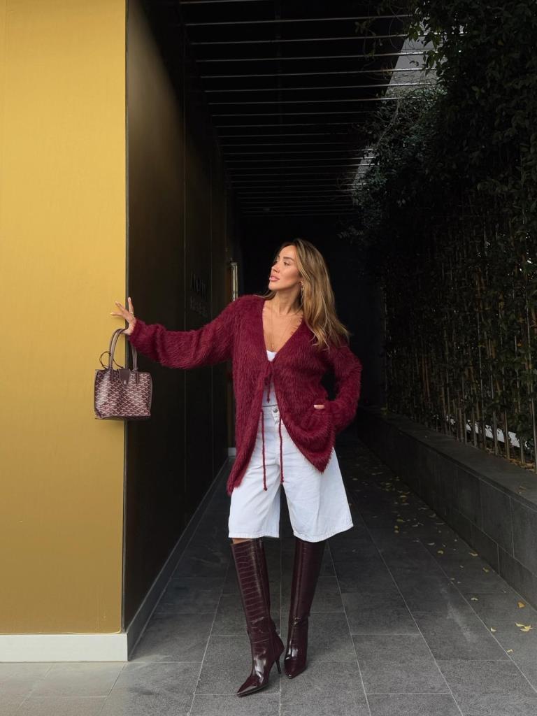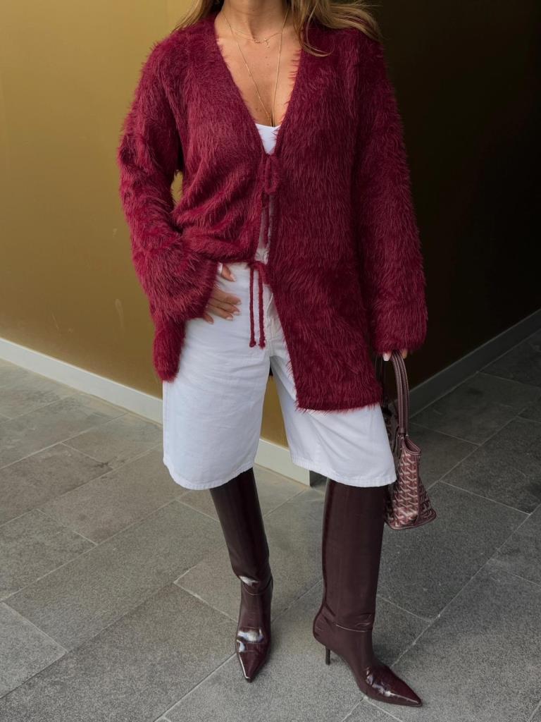 Bordo Peluş Yumuşak Dokulu Bağlamalı Uzun Triko Hırka