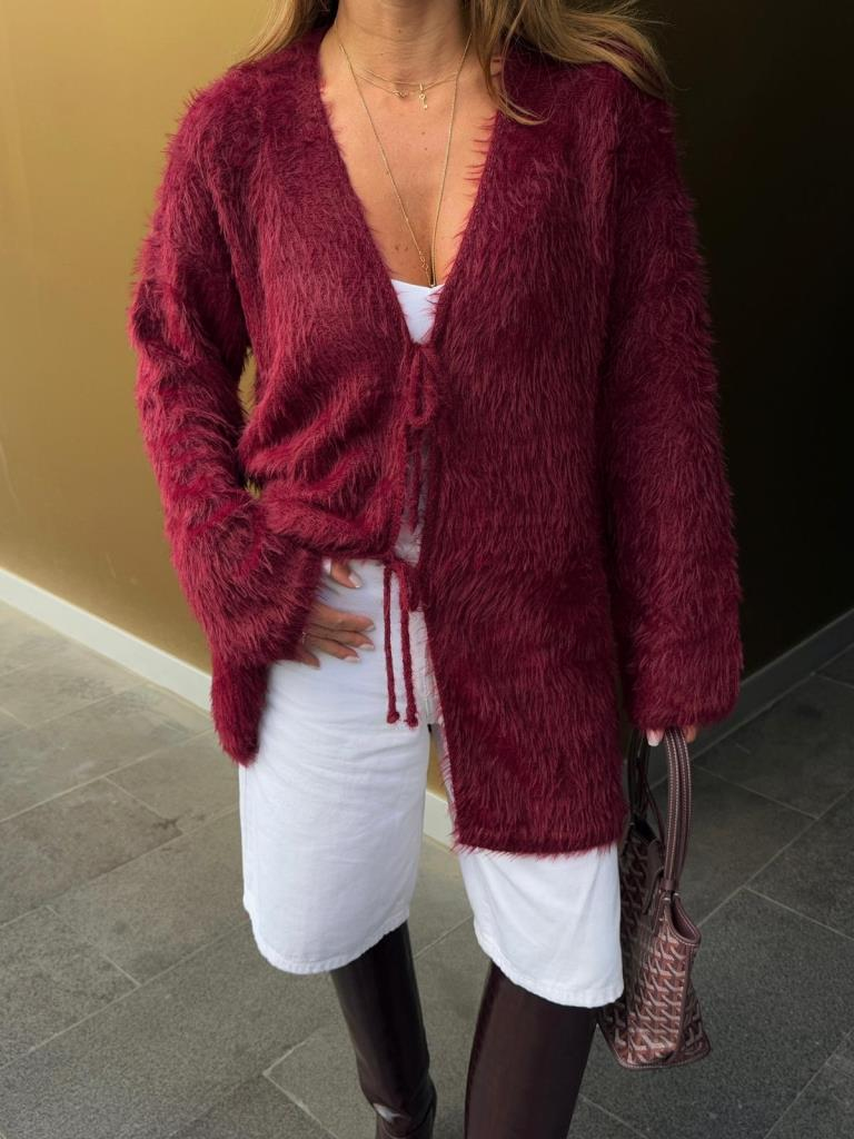 Bordo Peluş Yumuşak Dokulu Bağlamalı Uzun Triko Hırka (9064-BORDO)