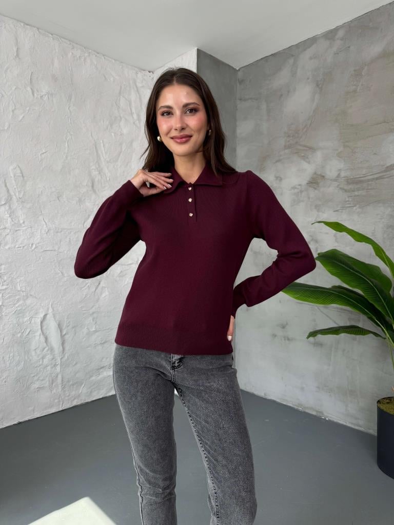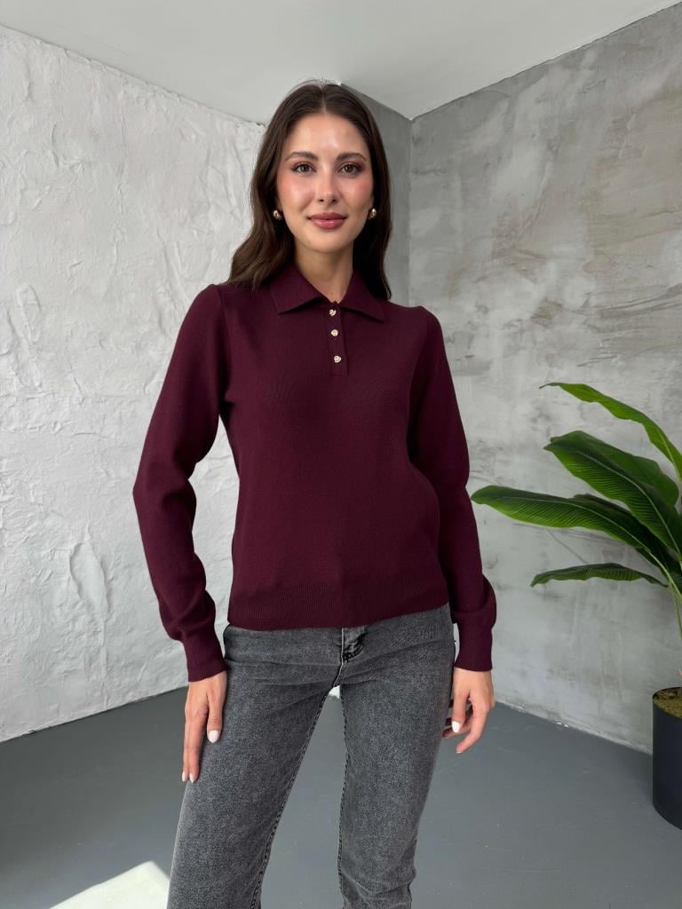 Bordo Polo Yaka Gül Düğmeli Triko Kazak (2402-Bordo)