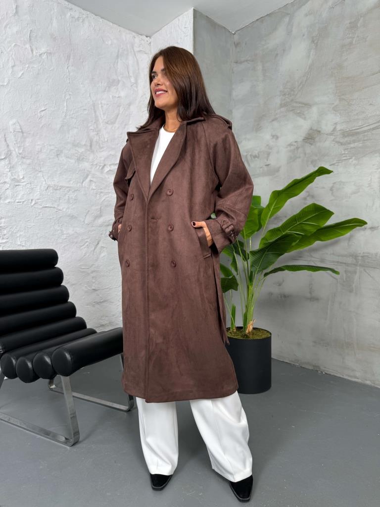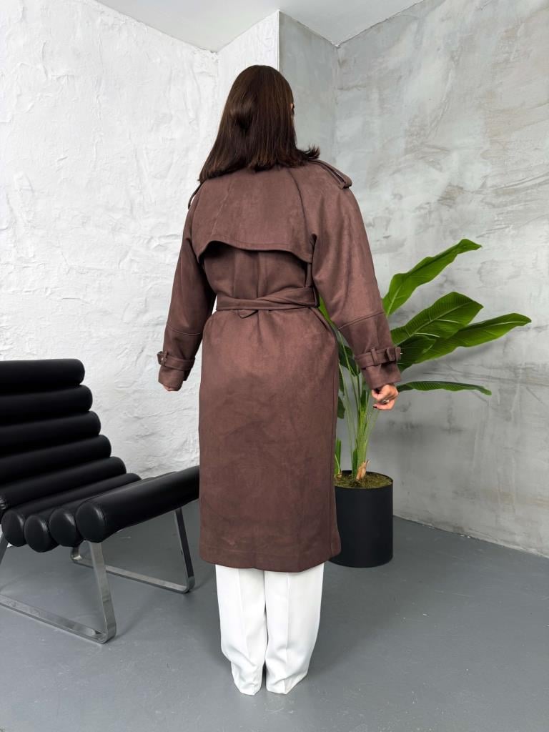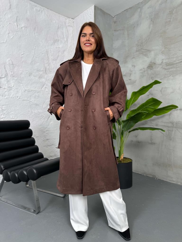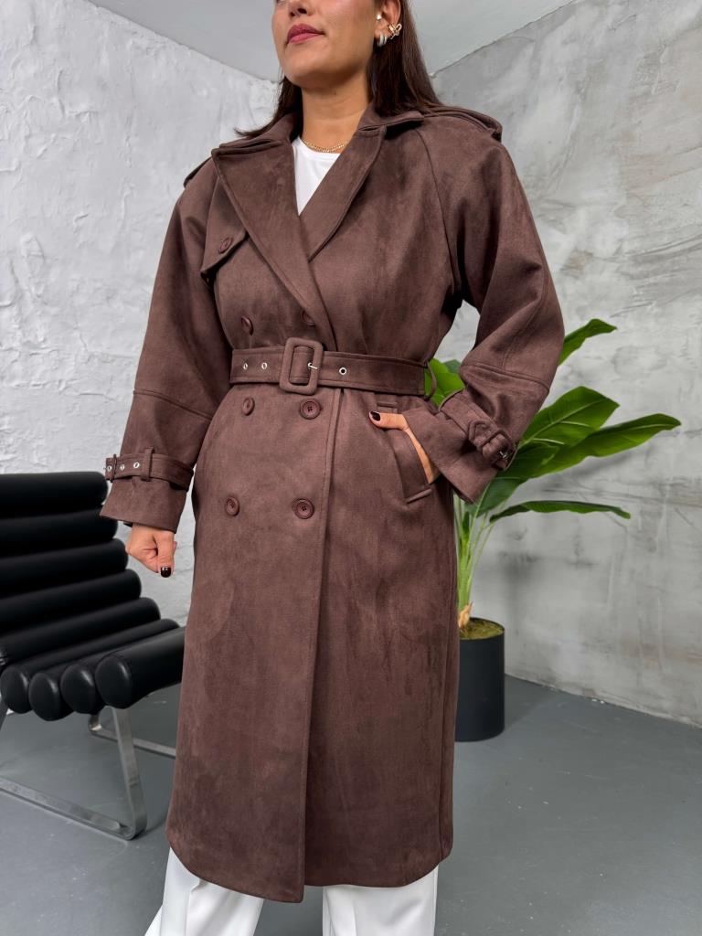 Kahve Omzu Apoletli Süet Trenç (9608-KAHVE)