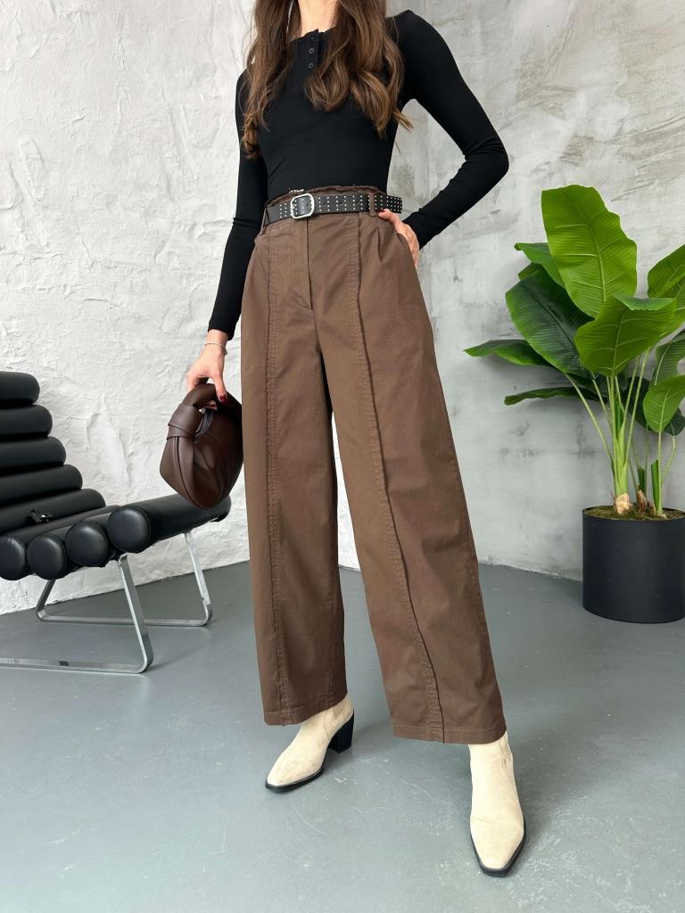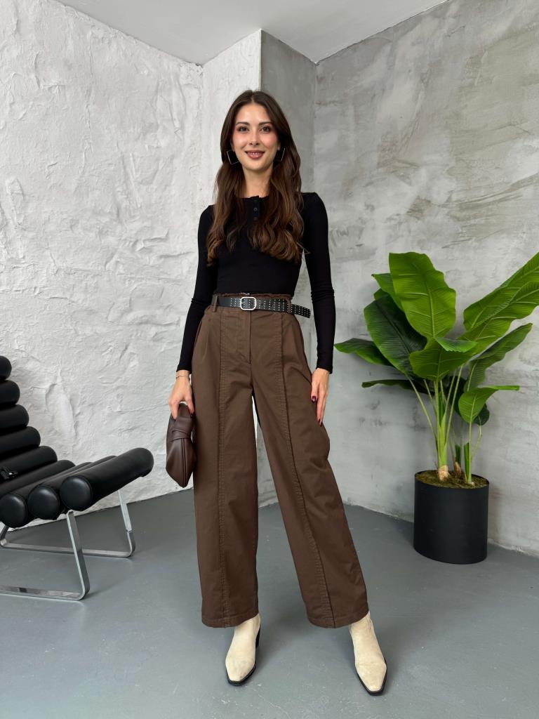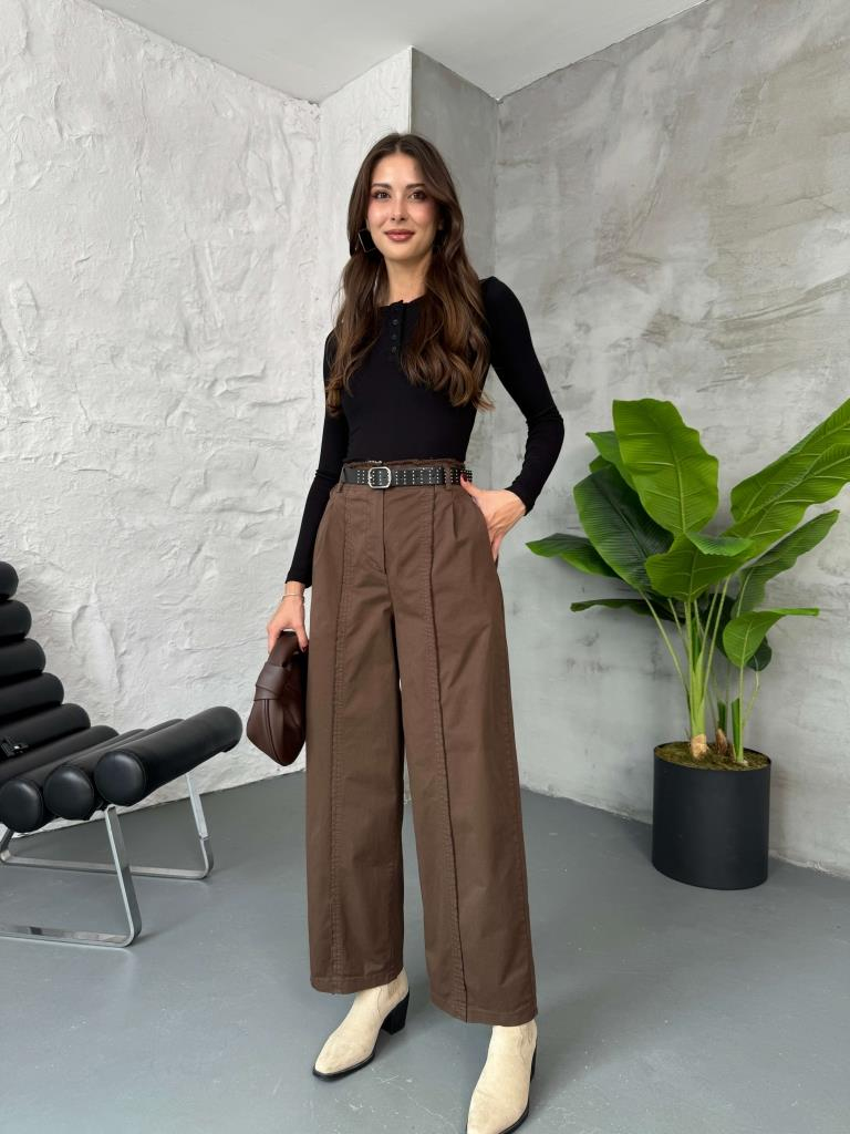 Kahve Zımba Kemerli Dikiş Detaylı Pantolon (51208-Kahverengi)