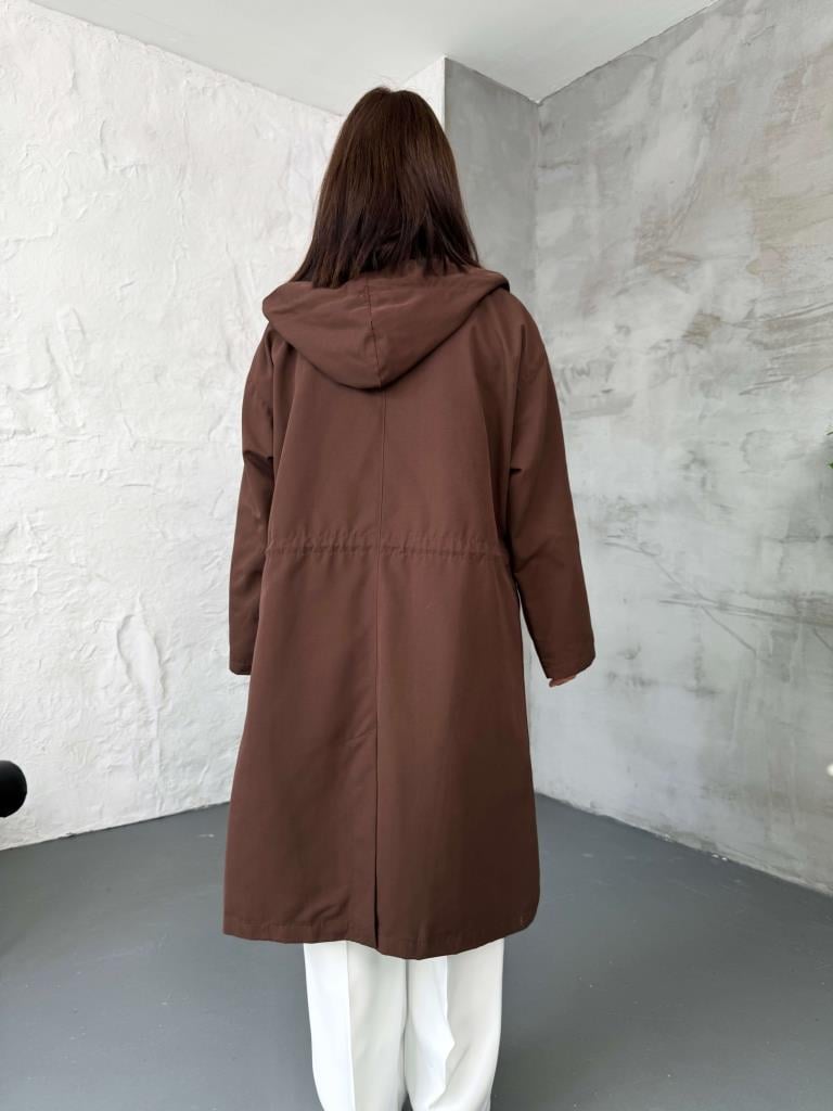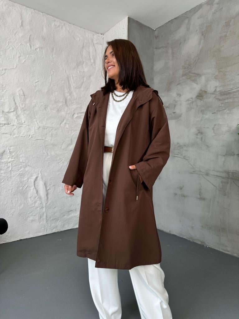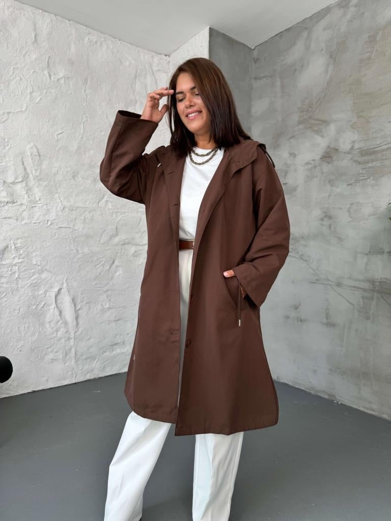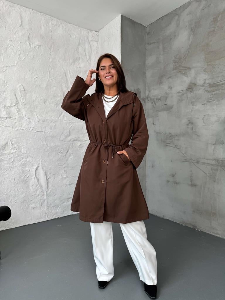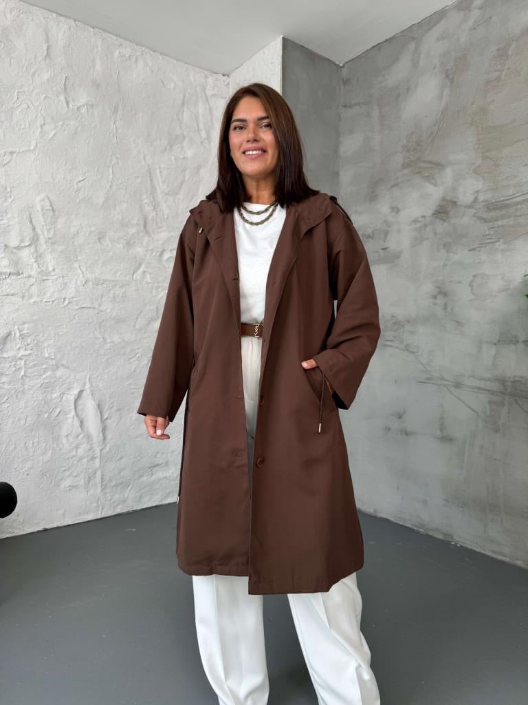Kahverengi Kapşonlu Boydan Düğmeli Trenç (7024-Kahverengi)