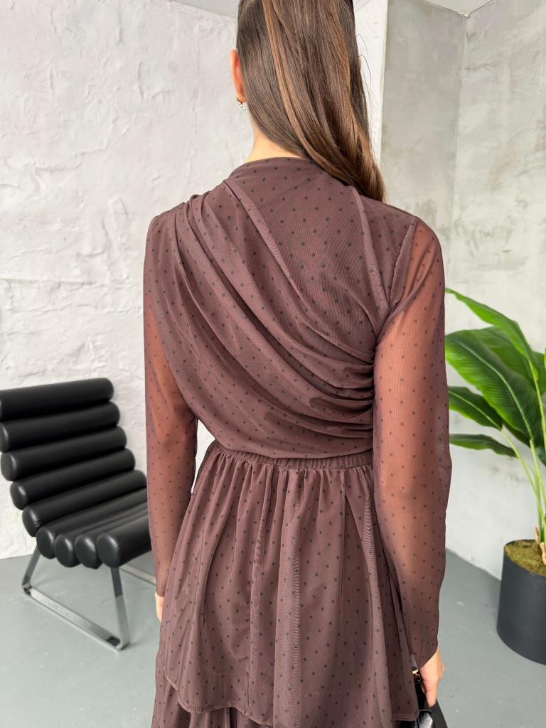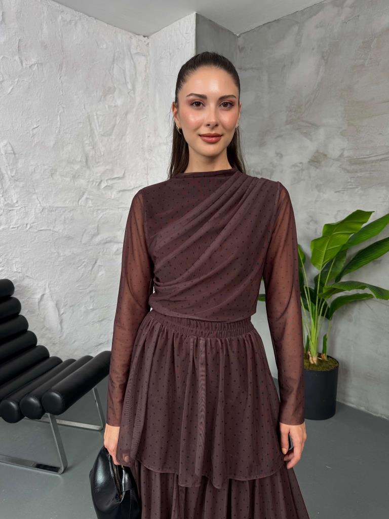 Kahverengi Puantiyeli Omuz Büzgülü Bluz (6003-Kahve)