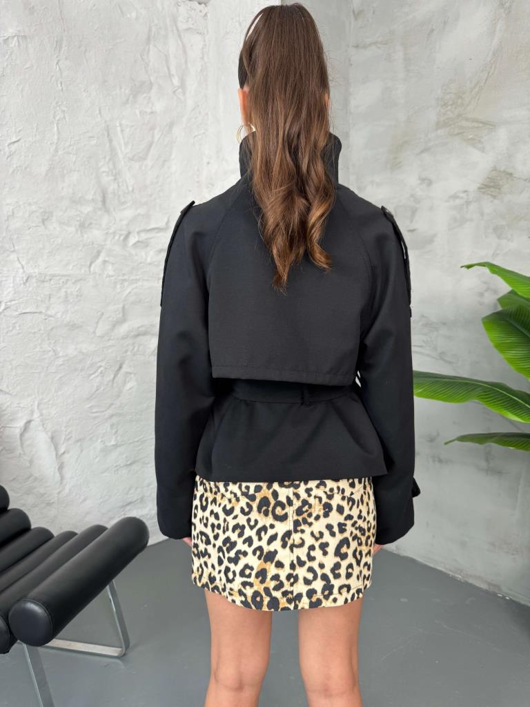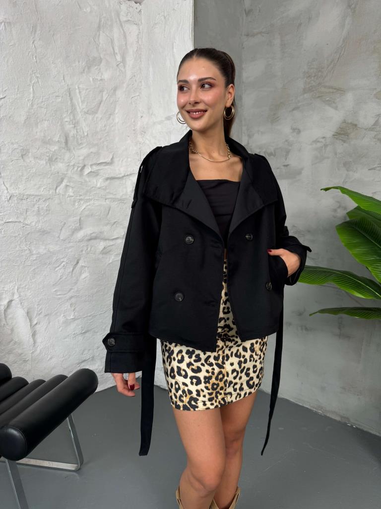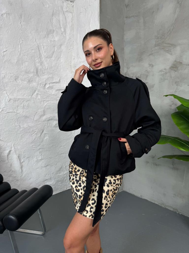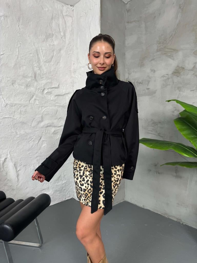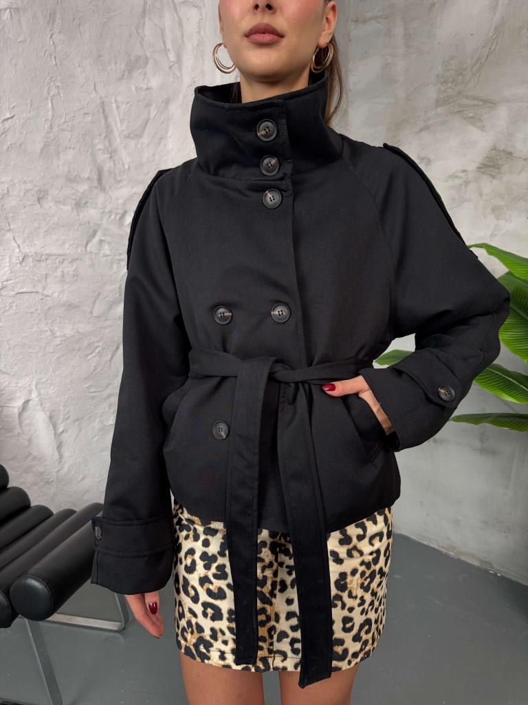 Siyah Dik Yaka Kuşaklı Kısa Trenç (580510-Siyah)