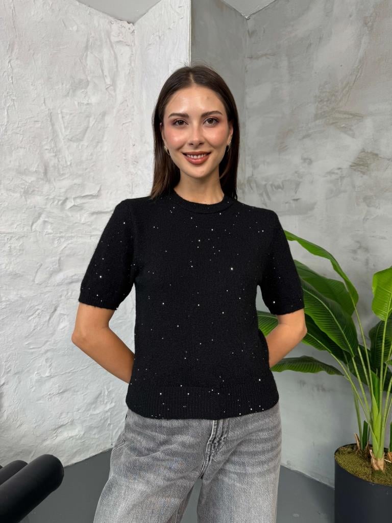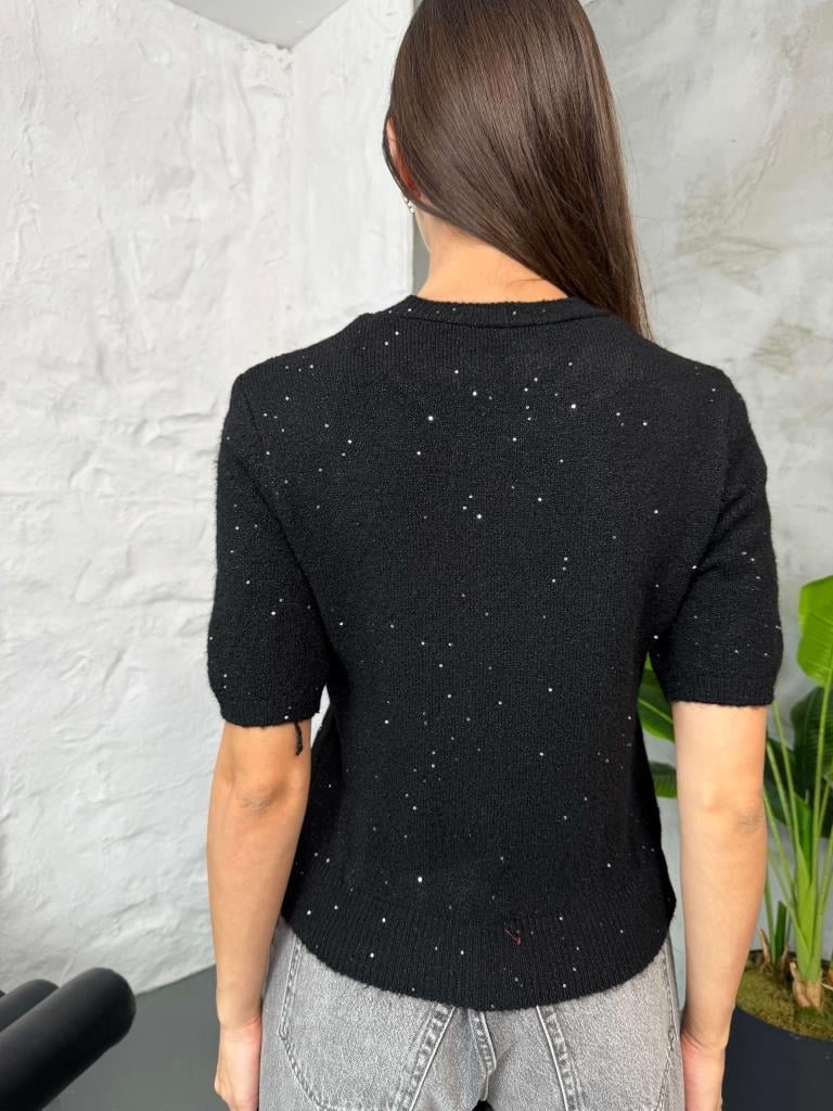 Siyah Pul Payet Kısa Kol Kazak (2372-Siyah)