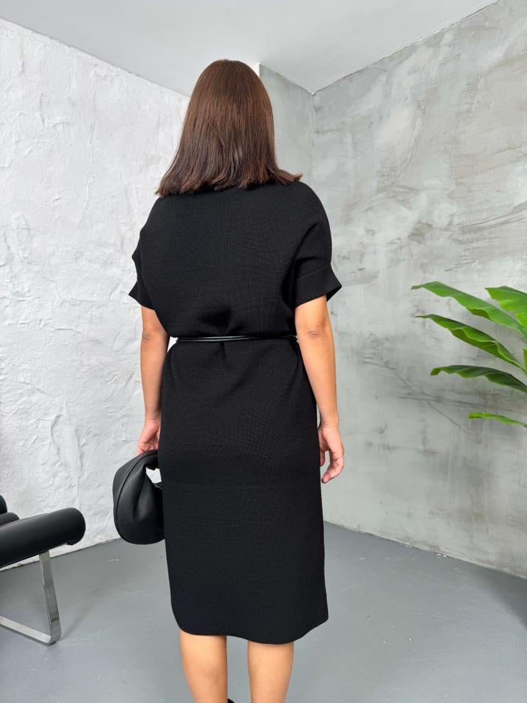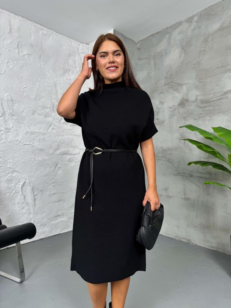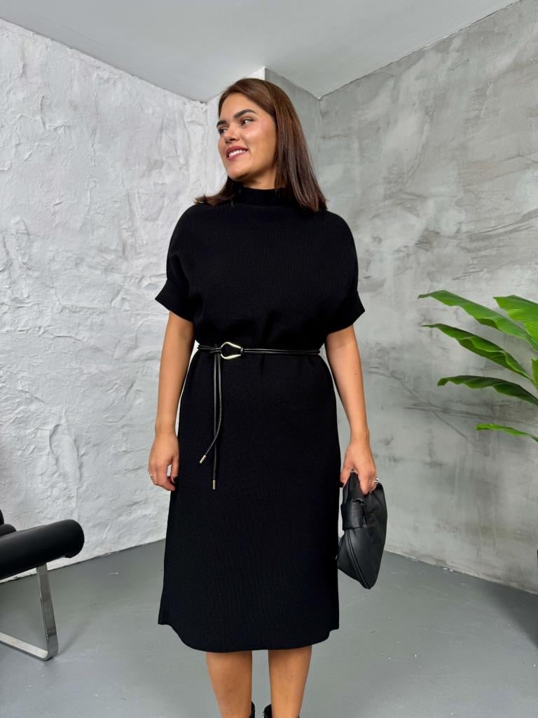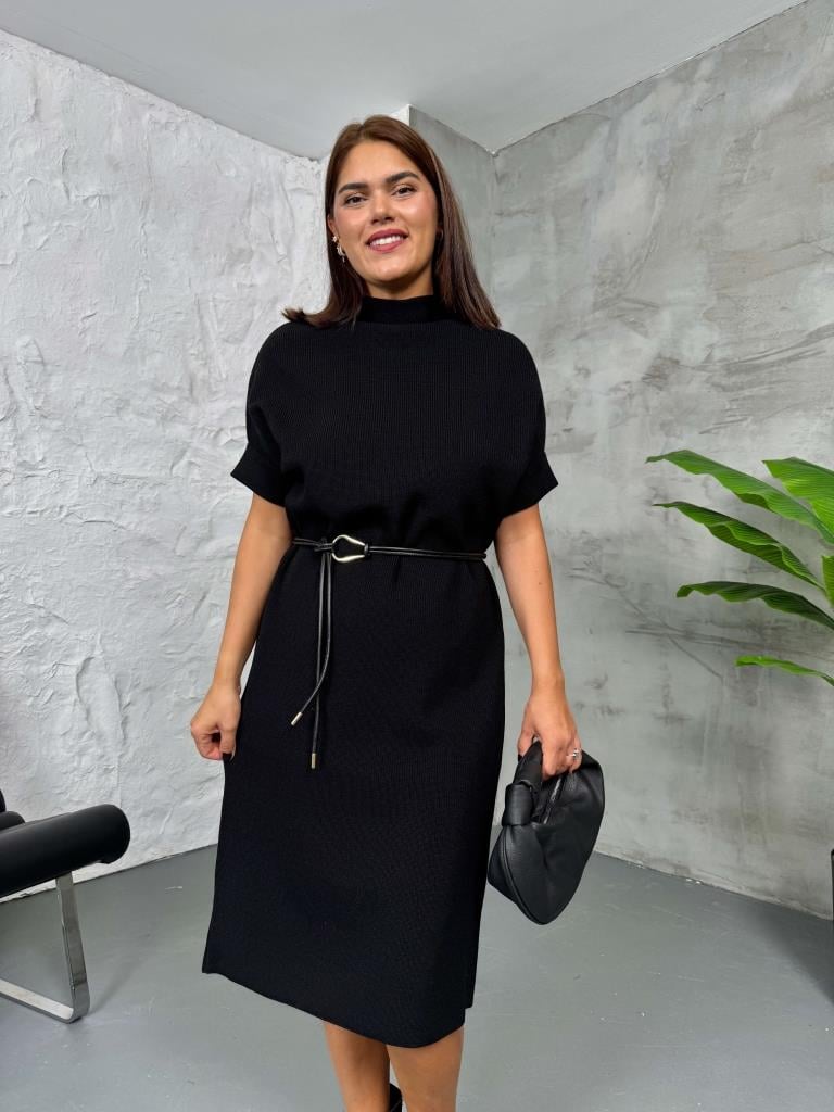 Siyah Yarasa Kol Kemerli Triko Elbise (2548-Siyah)