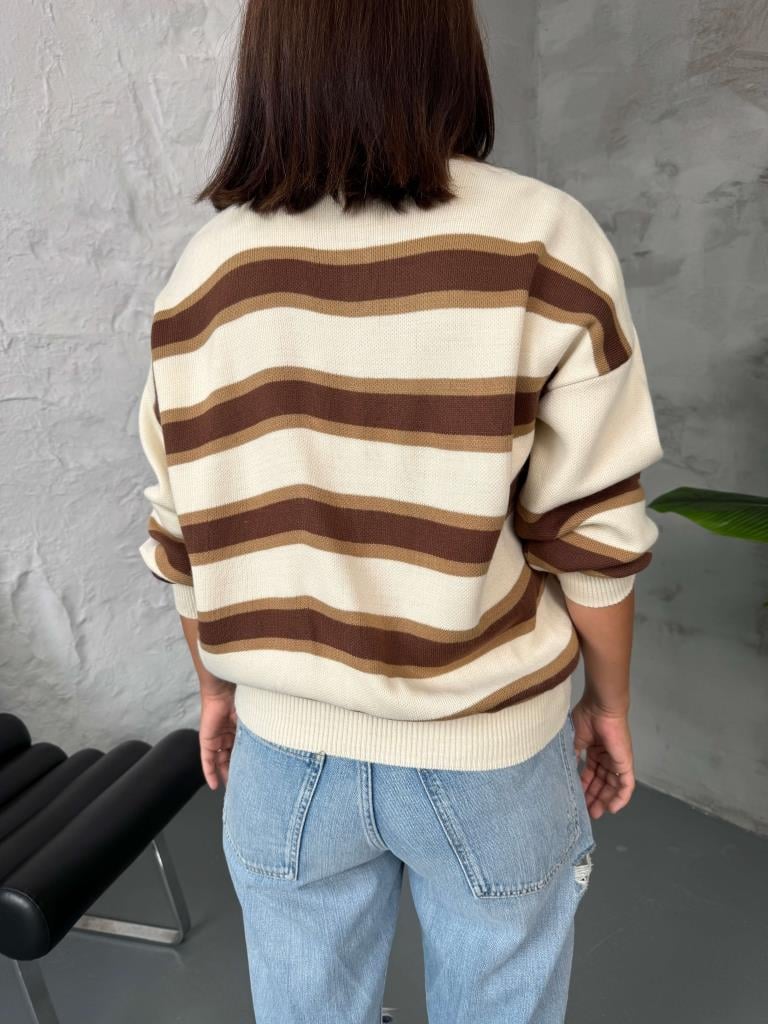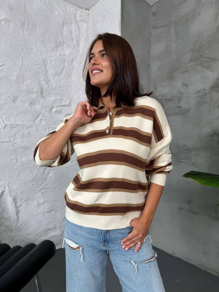 Taş Çizgili Polo Yaka Triko Kazak (34101-Taş)