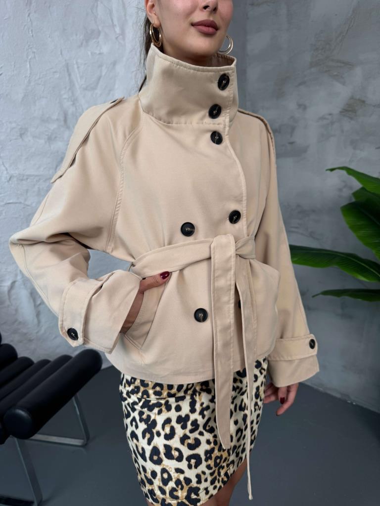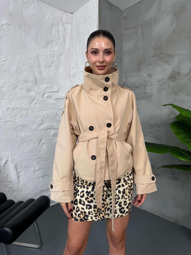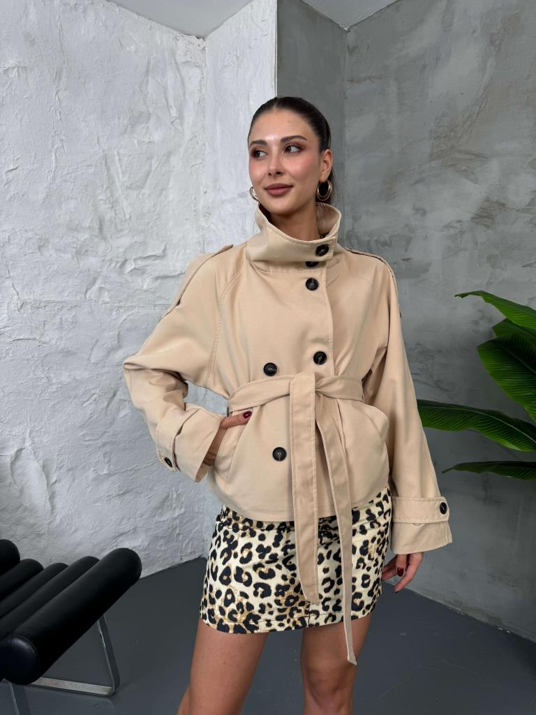 Taş Dik Yaka Kuşaklı Kısa Trenç (580510-Taş)
