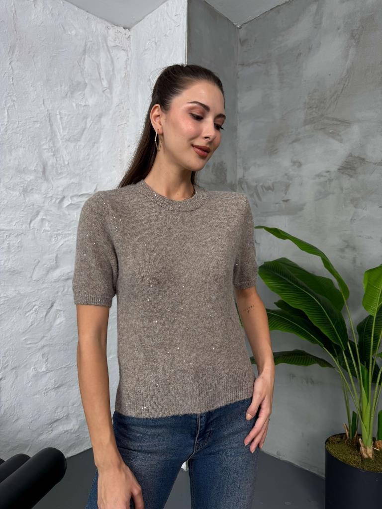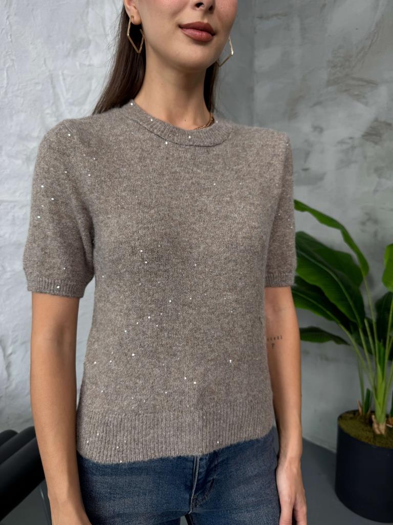 Ekru Pul Payet Kısa Kol Kazak Siyah Pul Payet Kısa Kol Kazak